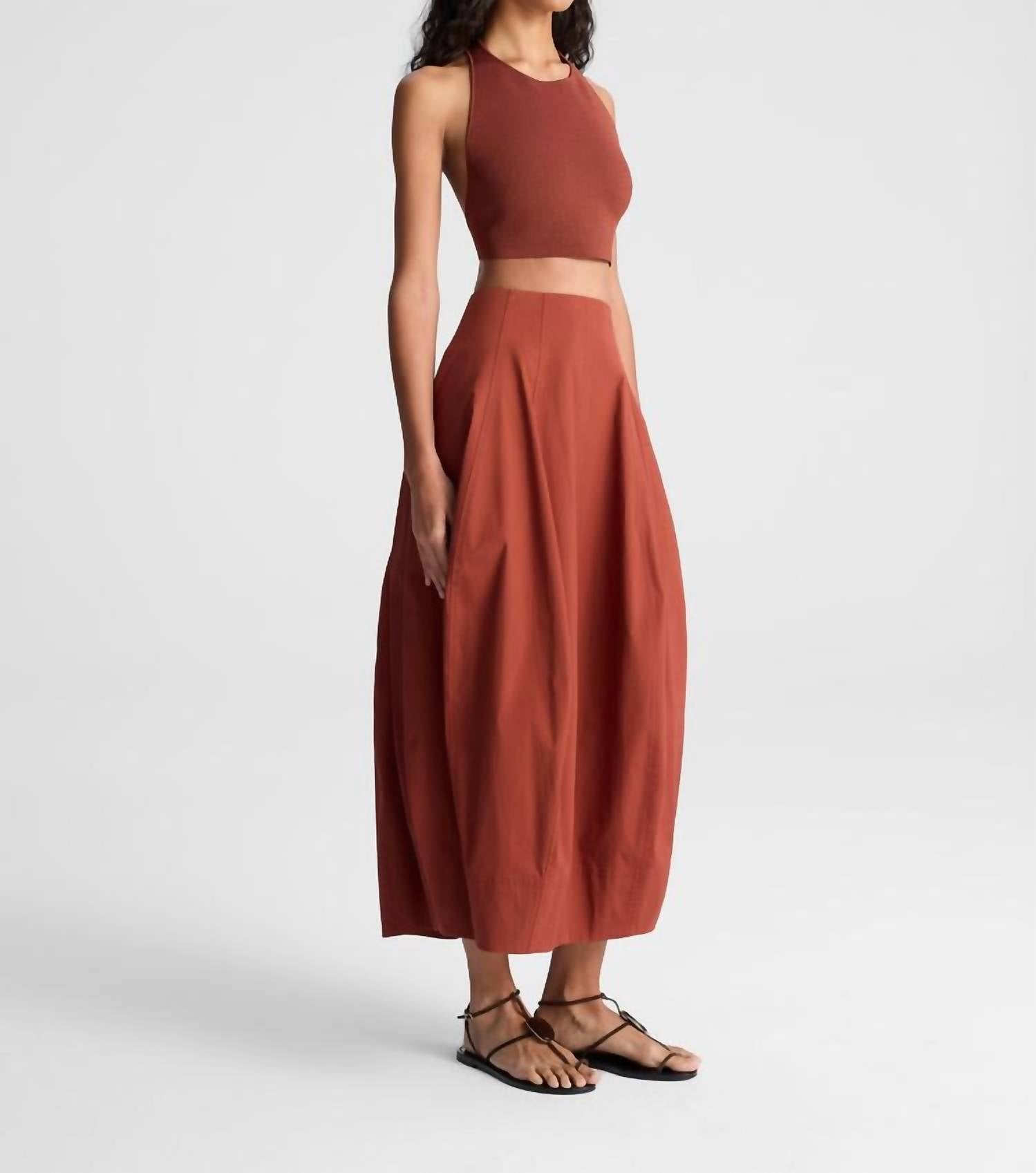 Elevate your holiday party look with the Veda Stretch Cotton Midi Skirt by A.L.C. in elegant Dark Bosco. Crafted from a comfortable 97% cotton and 3% elastane blend, this solid, minimalist skirt offers a flattering silhouette with a length of 34.75 inches. It features a zip closure for easy wear and is expertly designed for the spring season. Care Instructions: Dry clean only. Model is 5'10", wearing a size 4 with measurements of 30" waist and 52" hips.