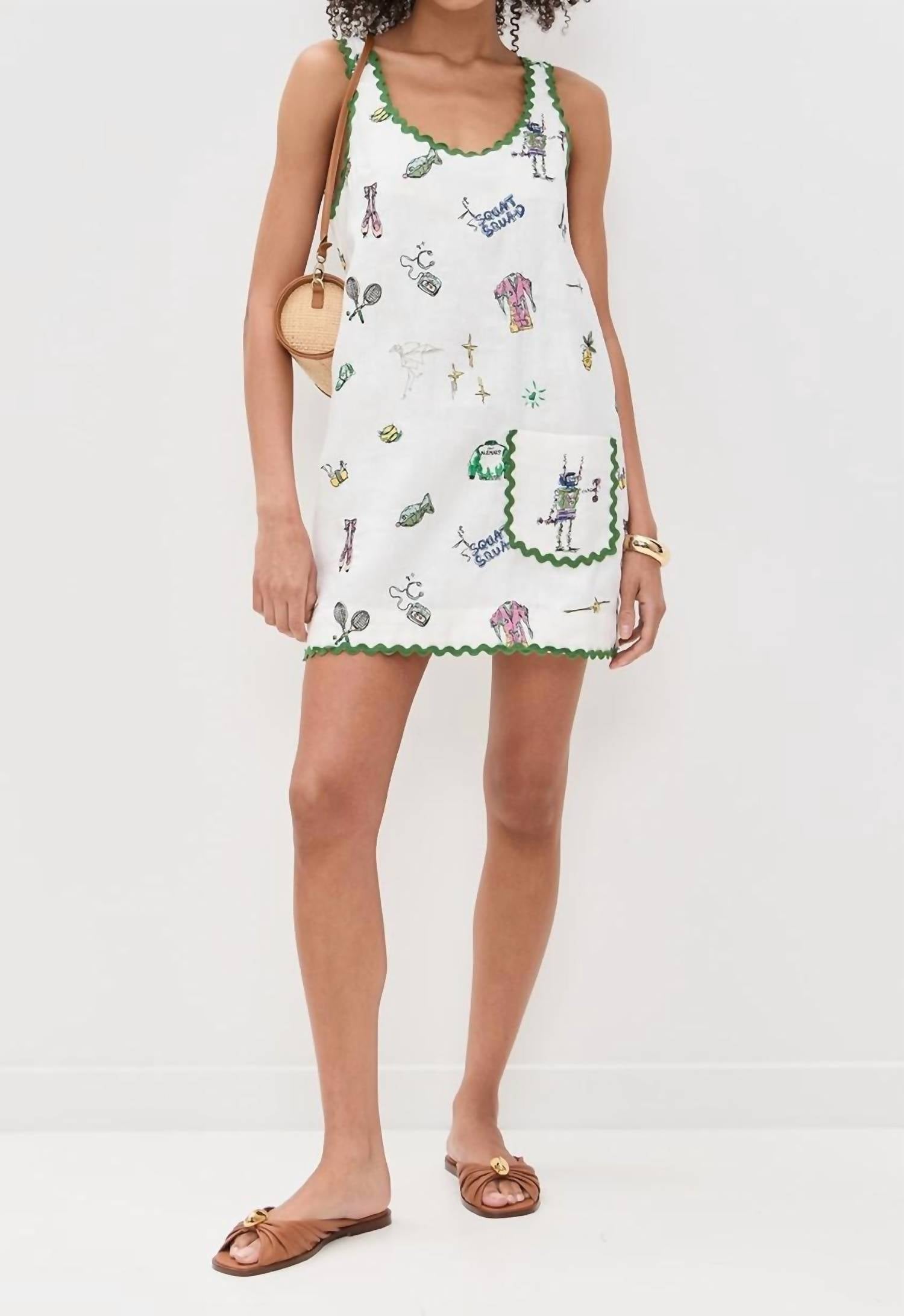 The perfect mini dress for those warmer months. Discover the Play Embroidered Mini Dress by ALEMAIS, a chic summer piece in cream that embodies boho style. This sleeveless shift dress is crafted from 100% linen with a 100% cotton lining, featuring intricate embroidered motifs and rickrack trim. It boasts a mini length of 32.75 inches (83.0 cm) and a scoop neck, complete with a button keyhole closure at the back and a practical patch front pocket. Imported from China, this dress is ideal for vacation occasions and should be dry cleaned to maintain its quality.