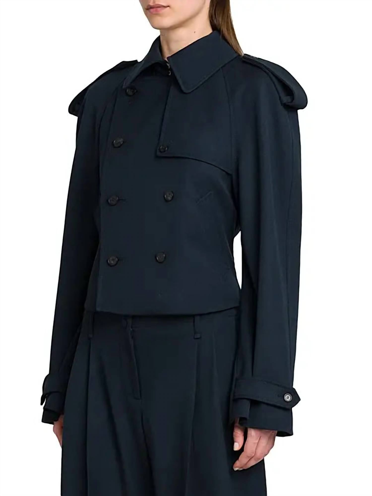 Experience timeless elegance with the Alexander McQueen Calvary Wool Twill Trench Jacket in navy. Crafted from 100% wool with a lining of 55% cotton and 45% cupro, this piece showcases a spread collar and a double-breast button closure, complete with shoulder epaulettes and belted button cuffs. Designed with practicality in mind, it features long sleeves and side slip pockets. For best care, this luxurious vintage-inspired coat should be dry-cleaned.