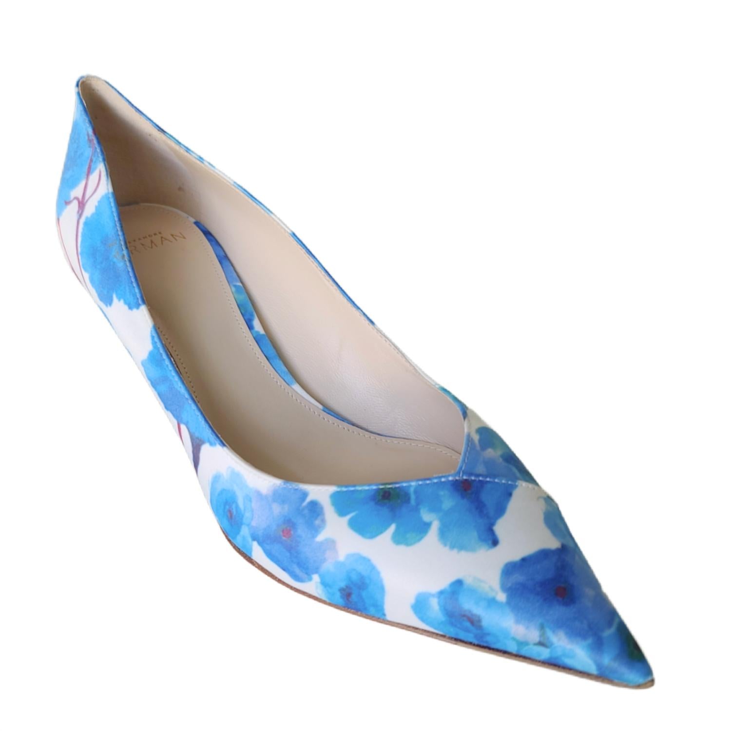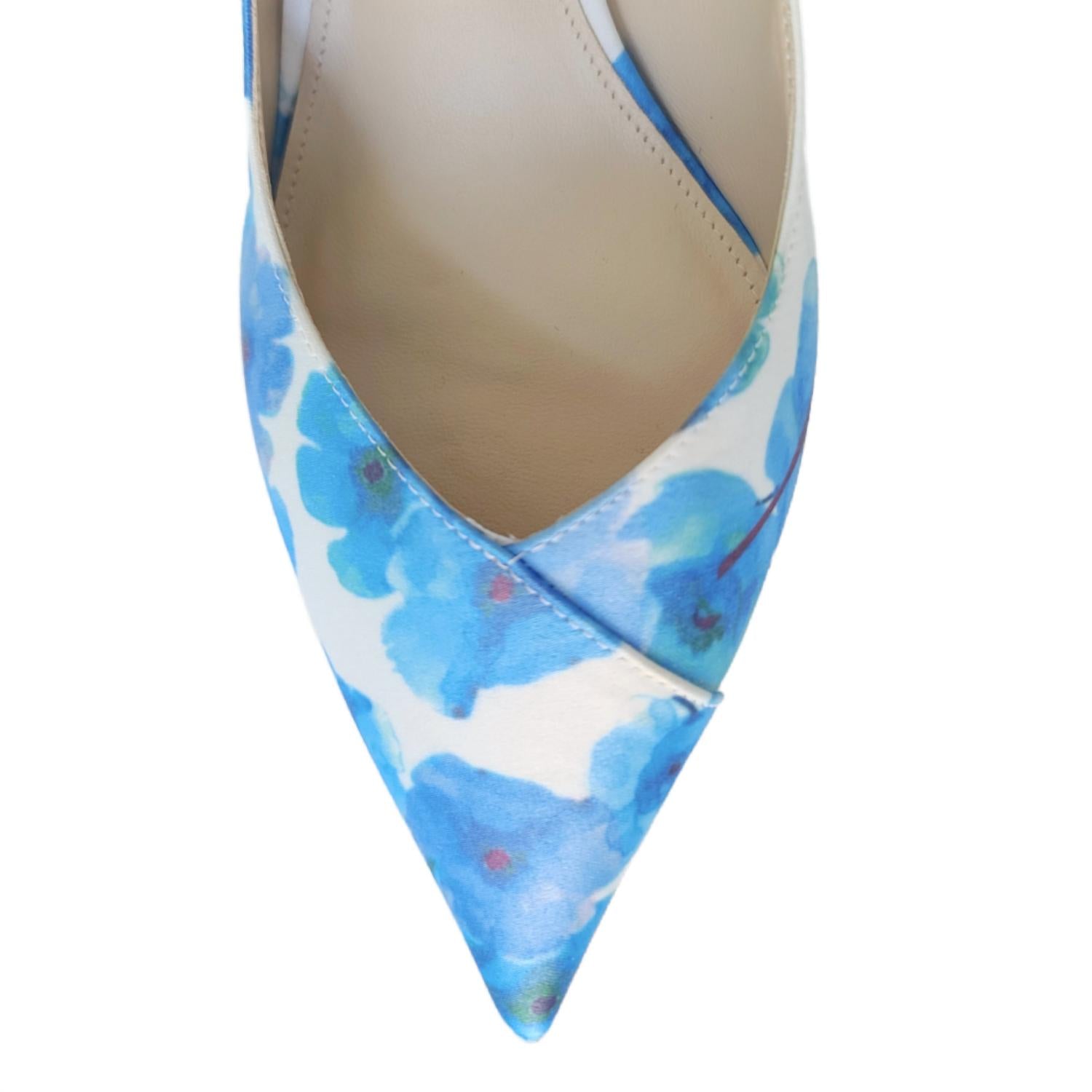 A altura perfeita para o dia e para a noite. Confeccionado em poliéster com estampa floral azul vibrante, lindamente decorado com detalhes em couro. Estes elegantes saltos agulha de 6 cm e bico fino sofisticado são perfeitos para chamar a atenção. Projetados com um prático estilo slip-on, eles contam com solado e forro de couro para maior luxo. Fabricados no Brasil, estes scarpins são laváveis ​​apenas com água.