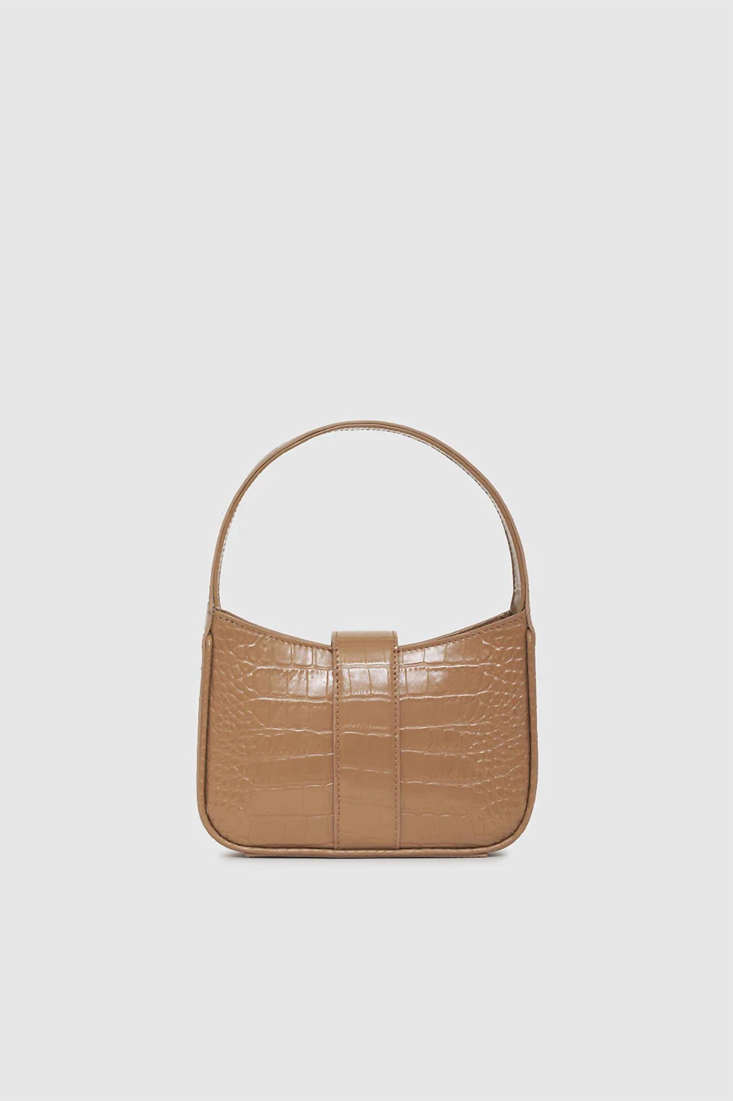 Discover the timeless elegance of the Cleo Bag by ANINE BING, an embossed camel shoulder accessory crafted entirely from luxurious 100% cow leather. Its croco-embossed texture with a subtle sheen pairs beautifully with the signature yellow gold ring-lock closure, offering both style and security. Measuring a compact height of 5" and width of 6.8" with a strap length of 12.2", this bag is perfect for those on-the-go moments. Care for it by spot cleaning as needed.