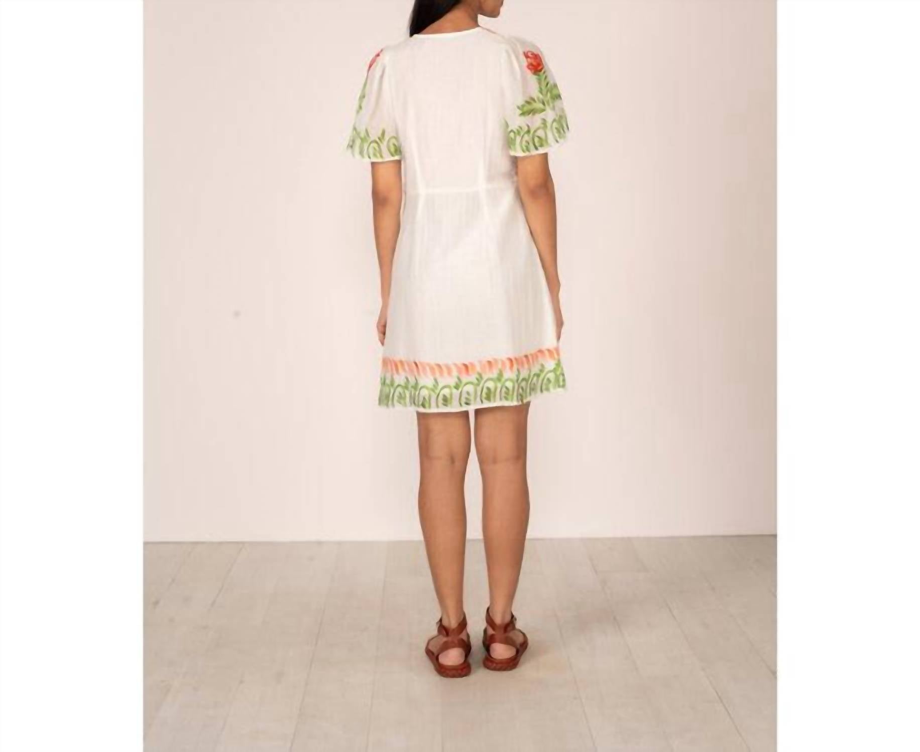 Elevate your vacation wardrobe with the Dumitara Mini Dress by Banjanan, a stunning piece from the label's latest collection. Crafted from a luxurious cotton blend, this shift silhouette boasts short sleeves and an intricate patterned design that exudes boho chic vibes. This white mini dress, with a convenient pull-on closure, is perfect for summer escapades. Care instructions recommend hand washing to preserve its exquisite craftsmanship, echoing the artistry of Jaipur artisans.