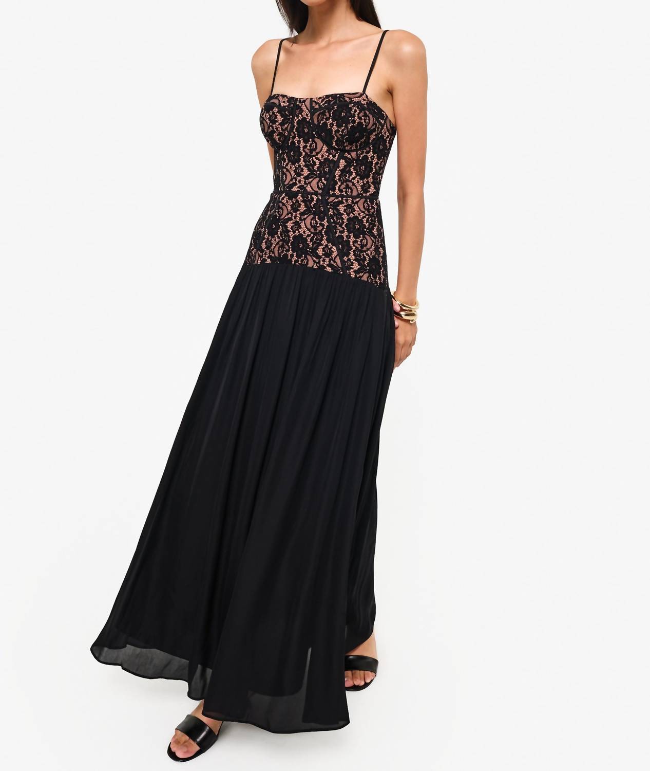 Meet the Cami NYC Corsica Lace Corset Dress, a stunning black maxi dress perfect for any evening event. This elegant piece showcases spaghetti straps and a square neckline, crafted from a blend of nylon, polyester, rayon, spandex, and silk, with a structured lace and crepe bodice for a fit-and-flare silhouette. The zip closure offers a seamless finish, while the underwire and boning construction enhance its flattering shape. For optimal care, dry clean only. Model wears size 0 and stands 5'9".