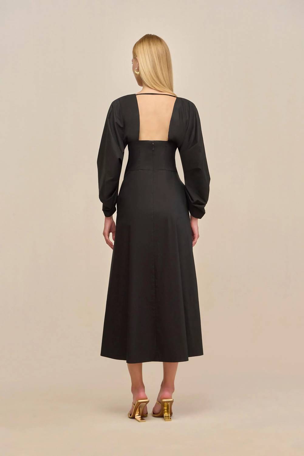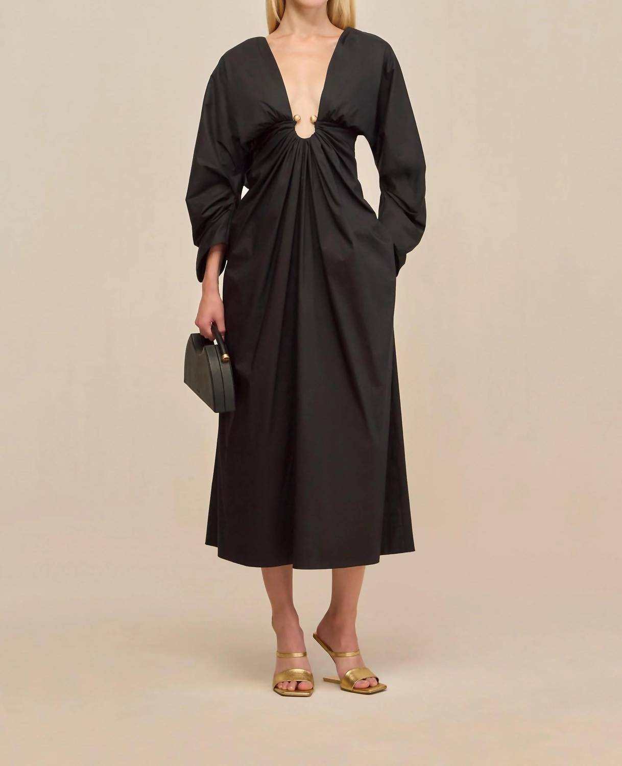 Introducing the Women's Elyza Dress by Cult Gaia in a sleek black monochrome. This wrap silhouette dress features long sleeves and a chic V-neck with golden hardware accenting. Made from breathable poplin, it falls to a flattering midi length perfect for summer vacations. Closure: Pull-on.