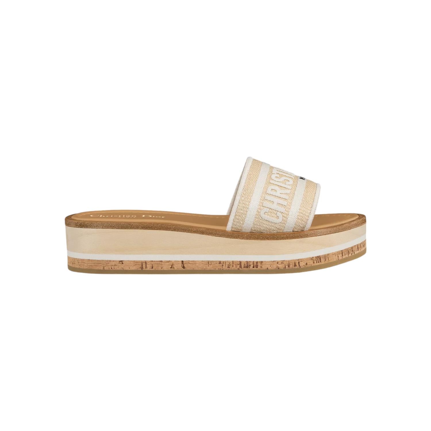 Classicly cute and all-day-wearable. We love this sandal. Elevate your fall wardrobe with the Dior Women's Dway Platform Slide, a modern take on casual elegance. Featuring a natural raffia and black cotton embroidered upper, this sandal boasts the iconic Christian Dior Paris signature. Its 4.5 cm (2 inches) platform heel combines wood, black rubber, and cork for a distinctive look. Perfectly suited for a boho chic holiday party, it fits true to size at 325 grams (11.5 ounces).
