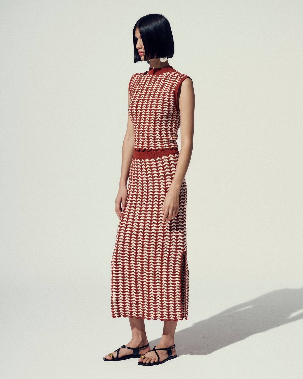 The Motupe Crochet Sleeveless Top by ESCVDO is a stunning piece from the SPONDYLUS collection, crafted with 100% cotton for a comfortable fit. Its "peregrino" style stitch is inspired by Inca and Moche iconography, presenting a unique patterned design in ivory-brown. This pull-on top is a testament to skillful handmade craftsmanship, with each piece created by an individual artisan. Care instructions recommend hand washing and laying flat to dry, making it an ideal choice for your summer travel wardrobe.