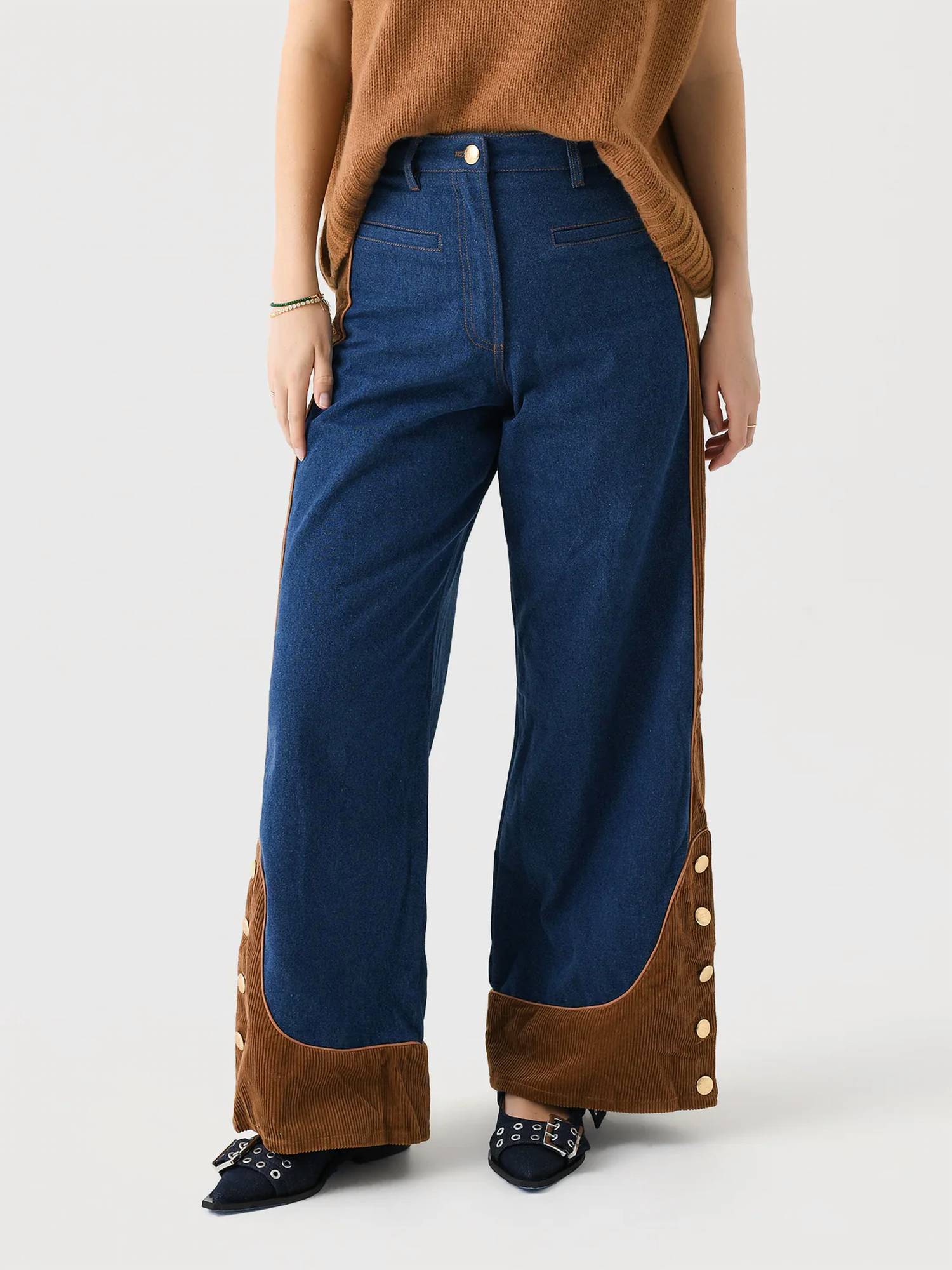 Tuck your favorite tee into these high-waist jeans for a more casual-cool feel. This item features corduroy side panels, front welt pockets, and belt loops. Made of 100% cotton.