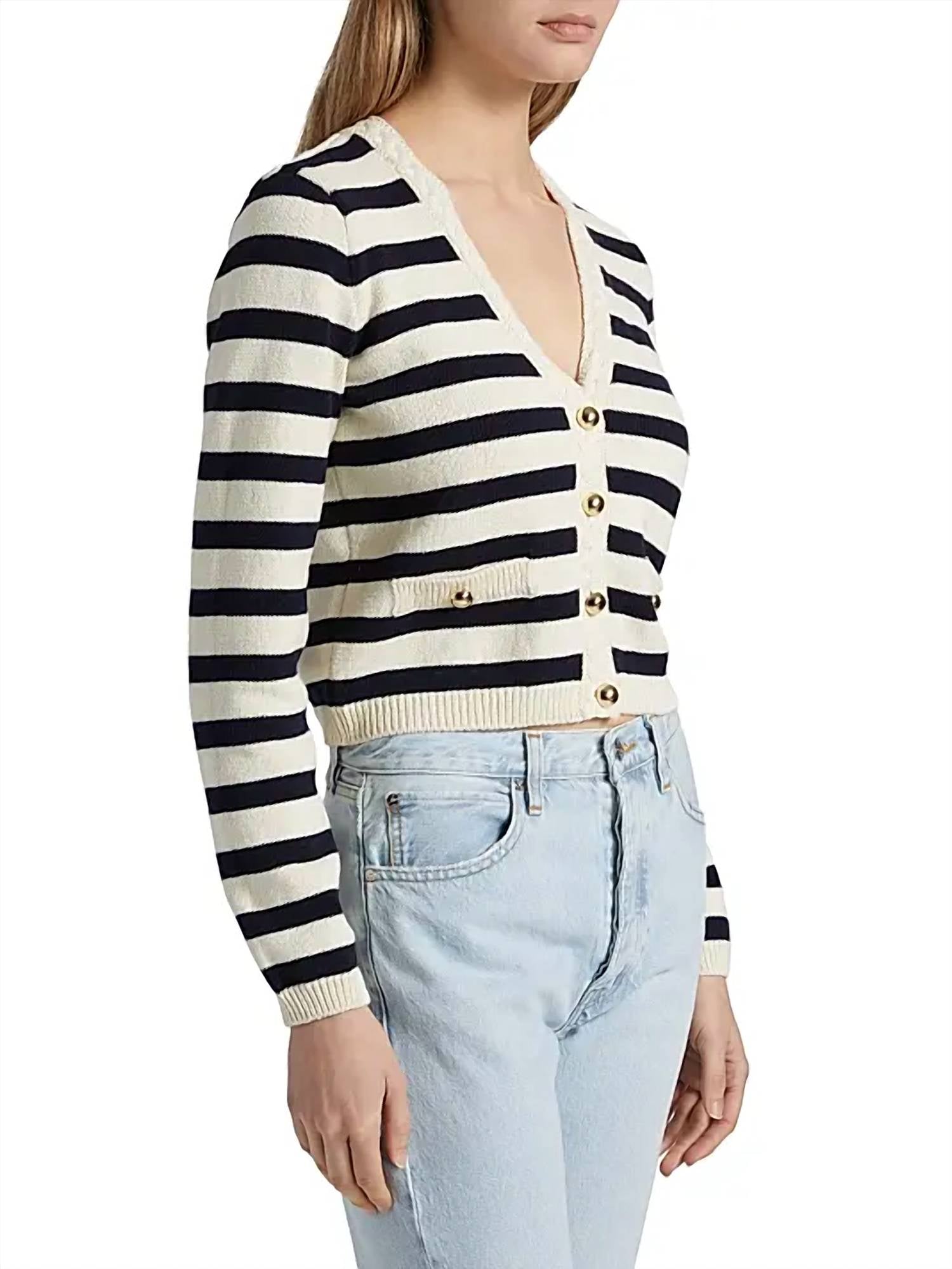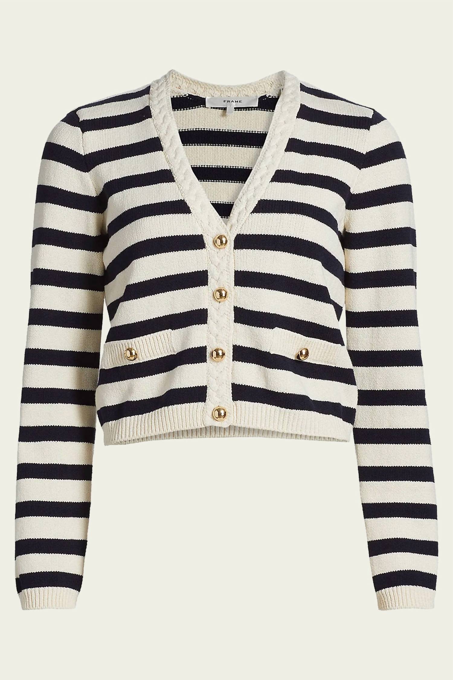 This cardigan will be a sweater-rotation favorite. Meet the Harbor Stripe Cardigan by FRAME, a sophisticated layering piece in a chic Navy Multi colorway. With long sleeves and a stylish V-neckline, this cardigan offers a sleek, pull-on silhouette perfect for various occasions. The garment, crafted from 75% cotton and 25% polyamide, is made in Bulgaria and embodies a timeless stripe pattern. Care for this cardigan by opting for a dry clean to maintain its elegant appearance.