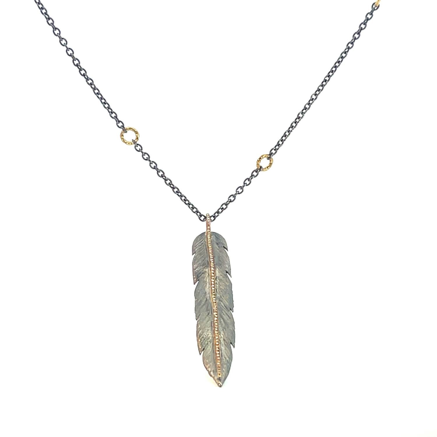 Both understated and impactful, you'll be reaching for this one-of-a-kind necklace season after season. Introducing the Women's Rhodium Silver Feather Necklace by Gasia, a fine jewelry piece that exudes elegance and sophistication. Crafted with sterling silver and featuring an eye-catching blackened feather charm adorned with 18KT gold veining, this necklace is a testament to luxury. The blackened sterling silver chain is accented by two 18K gold circle details, offering a striking contrast. Ideal for adding a touch of refined beauty to any ensemble.