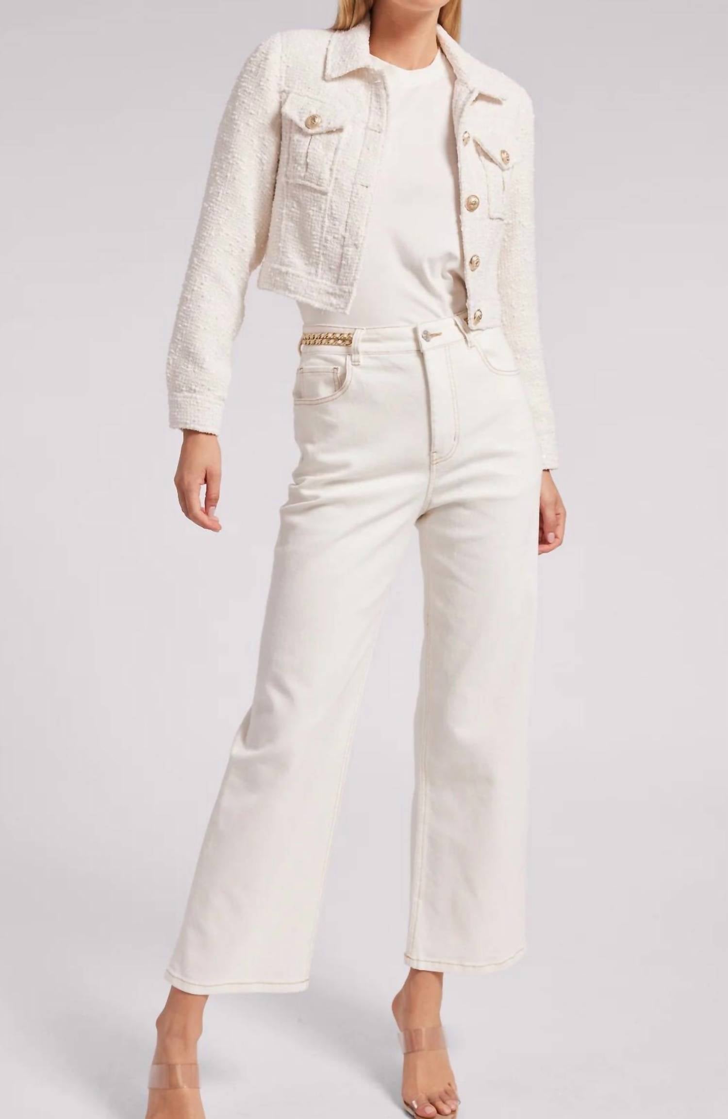 Esta jaqueta feminina em branco liso apresenta mangas compridas e design cropped, medindo 45 cm de comprimento, confeccionada inteiramente em tweed 100% poliéster com materiais reciclados. Adornada com fechos elegantes em botões dourados, ela complementa seu look com um toque de sofisticação. Para maior cuidado, recomenda-se lavagem a seco profissional. A modelo veste tamanho XS (Reino Unido 6/ UE 34/ EUA 2) e mede 1,77 m.