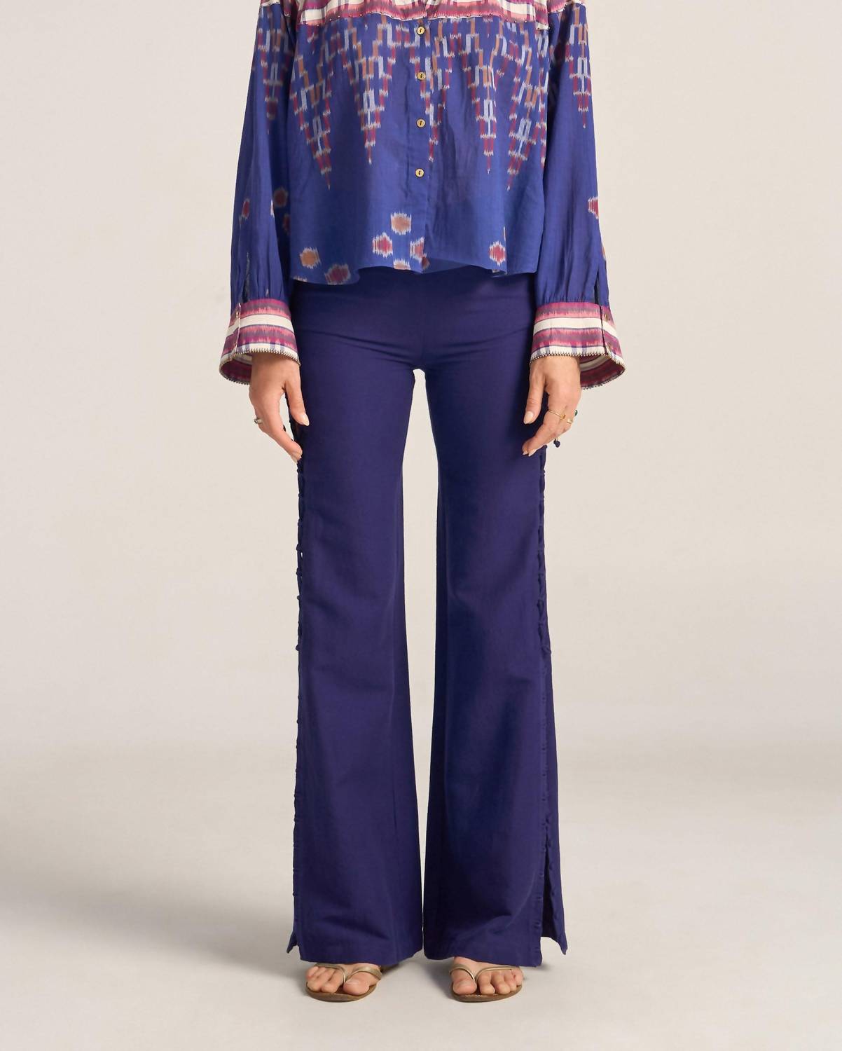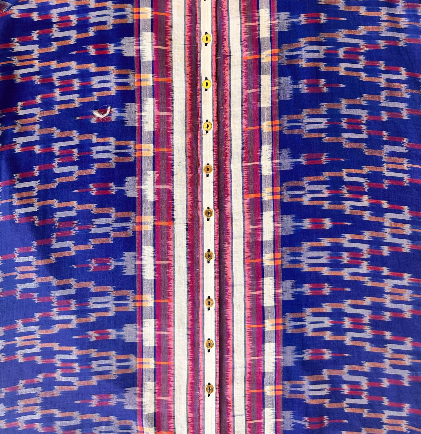 Presenting the Medusa Long Sleeve Shirt by Ilio Nema, a stunning piece in an Ikat scarf print to elevate your wardrobe. Crafted from organic cotton, this button-down shirt is adorned with delicate gold beading for an elegant finish. Made in India, the long sleeves are slightly oversized, while the gathered neckline offers a modern yet timeless style. Ideal for boho chic trends and holiday parties, this shirt effortlessly combines sophistication with artisanal details.
