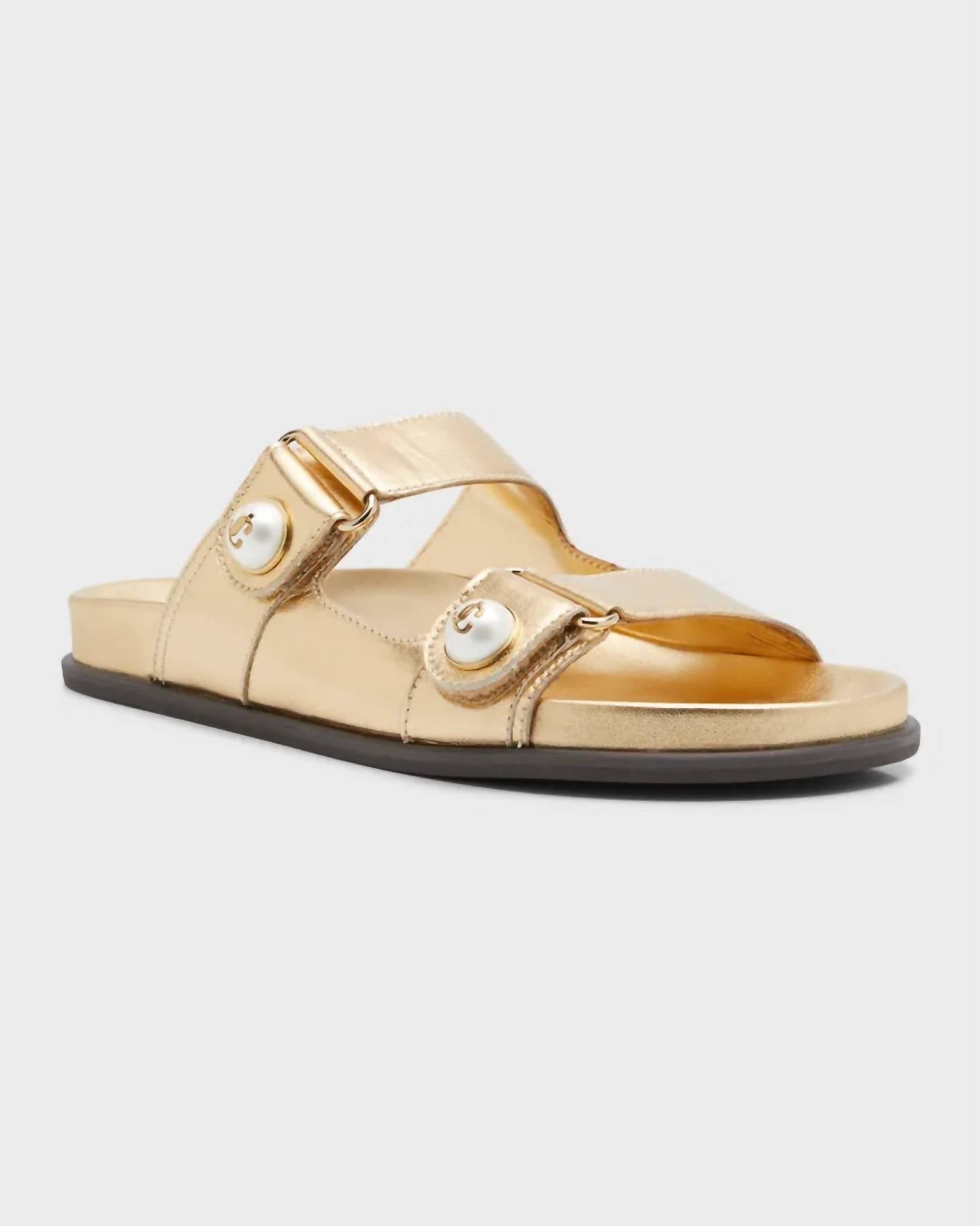 Eleve seu guarda-roupa de férias com o Chinelo Feminino Fayence Metallic da JIMMY CHOO, uma sandália luxuosa confeccionada em dourado cintilante. Este chinelo apresenta cabedal em couro napa metálico adornado com tiras com detalhes em pérolas e ferragens douradas. O design inclui um prático fecho de velcro, uma palmilha de couro confortável e um solado de borracha durável. Perfeita para adicionar um toque de elegância ao seu look de trabalho de primavera ou Páscoa, esta sandália possui salto baixo e bico aberto para facilitar o calce.