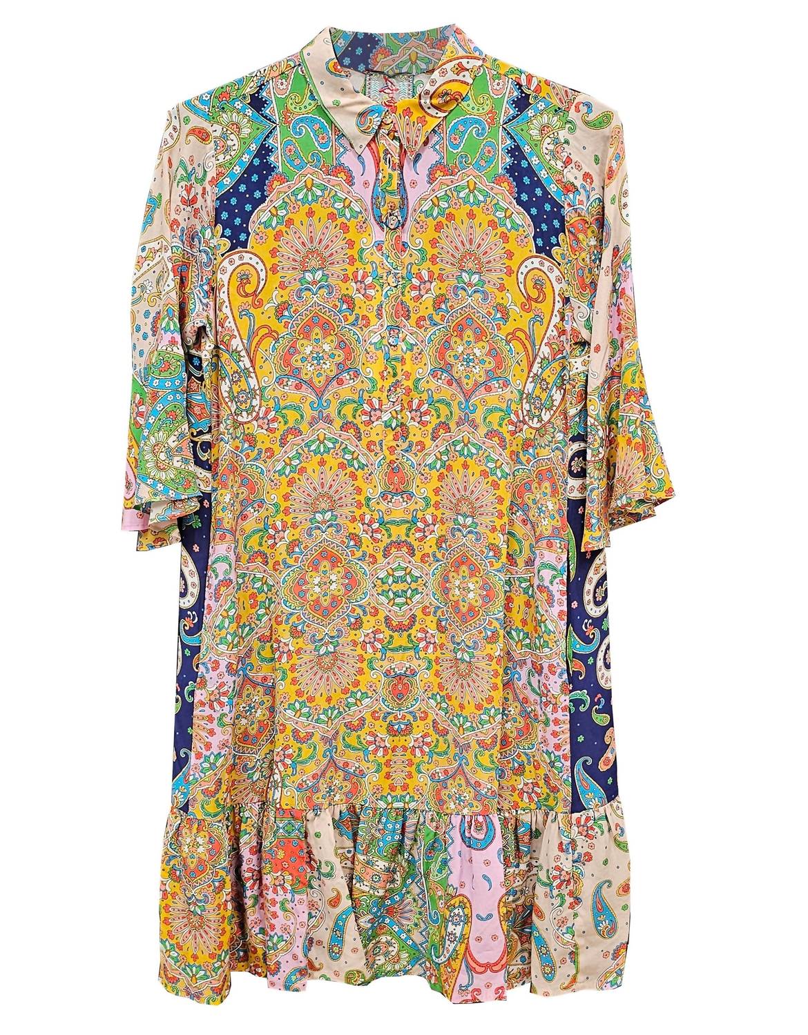 O minivestido perfeito para os meses mais quentes. Fechamento por botões. Babados na parte inferior. Gola estilo camisa. Mangas três quartos. Tecido: Seda. Lavagem a seco somente.