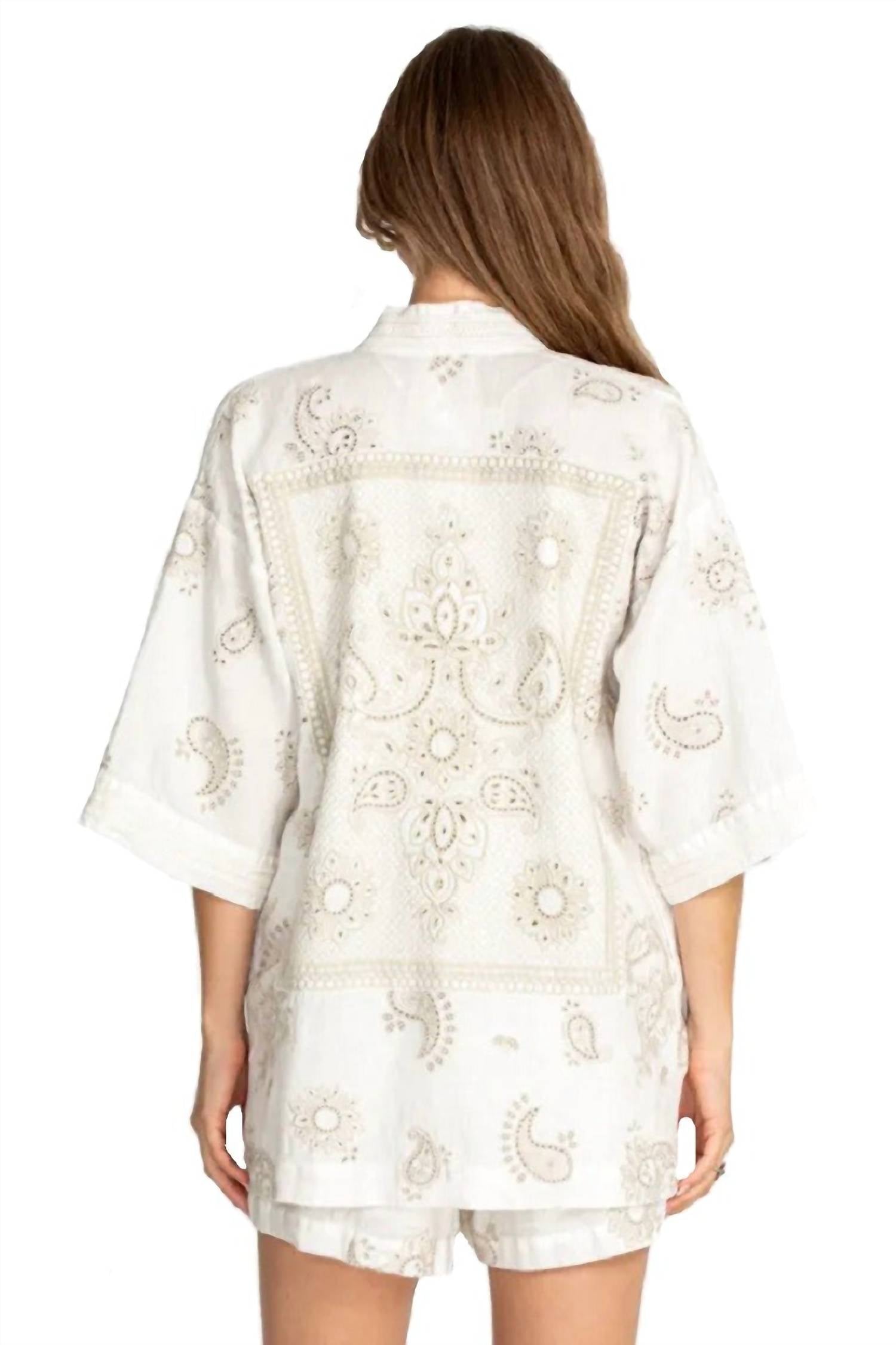 Um ajuste clássico que funciona tão bem abotoado quanto aberto. 100% linho. Acabamentos em renda. Medidas para um tamanho médio: Comprimento - 32", Busto - 46". Com seus motivos paisley e tecido de linho macio, o quimono Faye é estiloso e confortável. Os punhos e as carcelas forrados adicionam estrutura à peça, criando um contraste discreto, e o tecido de linho é ideal para criar um efeito drapeado sofisticado.