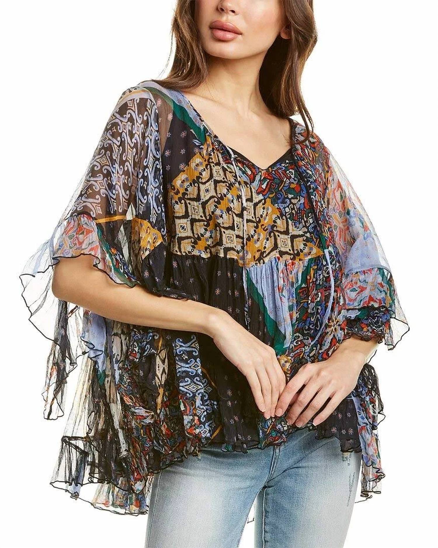 Combine isso com seus jeans e chinelos favoritos para sua próxima noite entre amigas. Manga curta. Seda estampada. Babados. 100% seda. Importado. Fecho de pressão. Lavável à máquina.