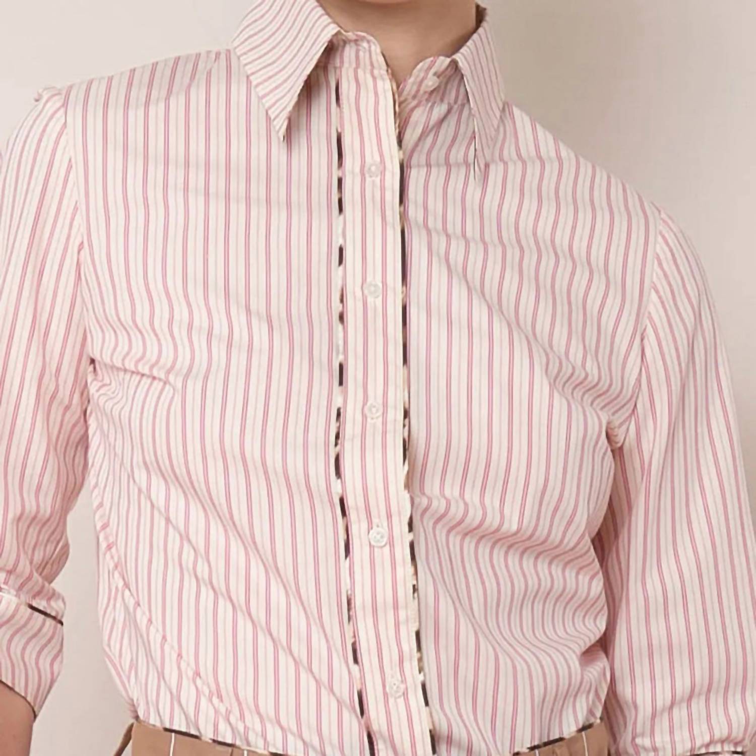 Combine isso com seus jeans e chinelos favoritos para sua próxima noite entre amigas. Descubra a blusa listrada Emmanuelle da LA PRESTIC OUISTON, uma escolha elegante em rosa para o seu guarda-roupa de trabalho de primavera. Esta blusa apresenta mangas três quartos e uma gola elegante, combinando perfeitamente com sua elegante estampa listrada. Confeccionada em 100% algodão, oferece conforto e respirabilidade com um prático fecho de botão. As instruções de cuidado incluem lavagem à máquina e secagem em tambor para fácil manutenção.