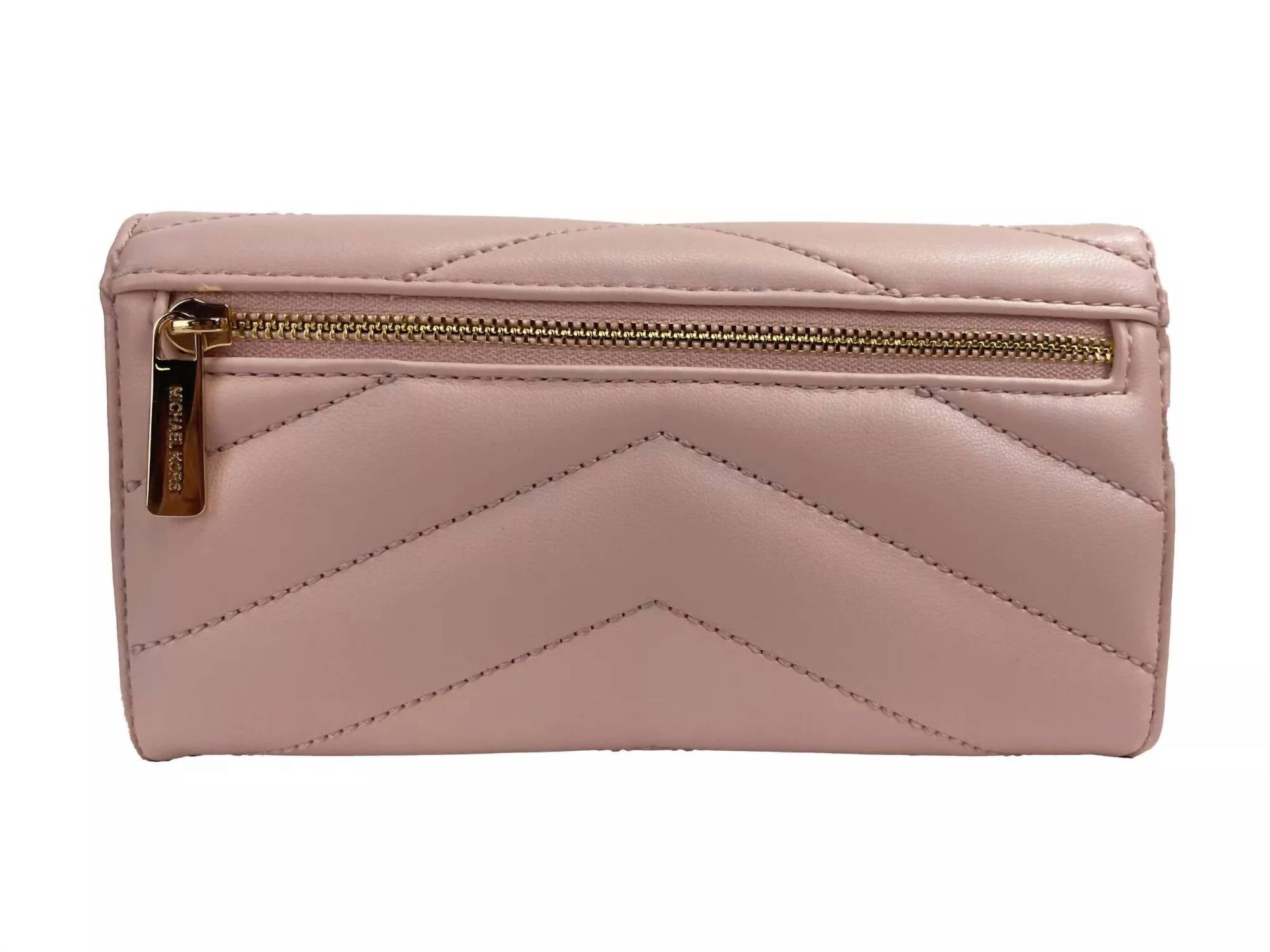 Aprimore seus acessórios com esta carteira chique. Sua aparência marcante destaca seu estilo pessoal, enquanto seus compartimentos oferecem armazenamento eficiente para seus itens financeiros essenciais. Apresentamos a carteira tripla MICHAEL KORS Jet Set Travel grande em couro acolchoado, na elegante cor Powder Blush. Confeccionada em couro de alta qualidade, esta carteira é perfeita para organizar seus itens essenciais, com seu porta-documentos com foto e sete compartimentos para cartões. Possui uma aba prática com fecho de botão para maior segurança. Com dimensões de 17,78 cm (C) x 10,16 cm (A) x 2,54 cm (P), ela combina elegância e funcionalidade, tornando-se um acessório ideal para o seu dia a dia.