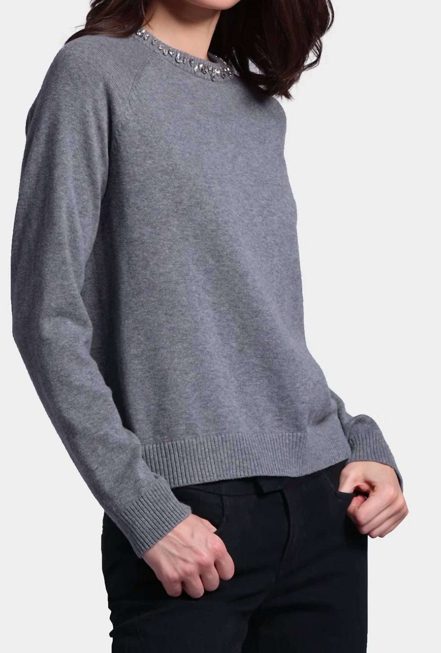 Experience the perfect blend of comfort and style with this trendy crew neck sweater, designed to effortlessly elevate your wardrobe. Pair it with your favorite denim and loafers for the perfect look. Introducing the Raglan Jewel Crew Neck Sweater by Minnie Rose in elegant Gray Shadow, perfect for cozy sophistication. This long sleeve piece, made from a luxurious blend of 95% cotton and 5% cashmere, features a flattering jewel-adorned crew neckline. The pull-on design offers ease, while the raglan sleeves add a relaxed charm. Care: Dry clean only for best results.