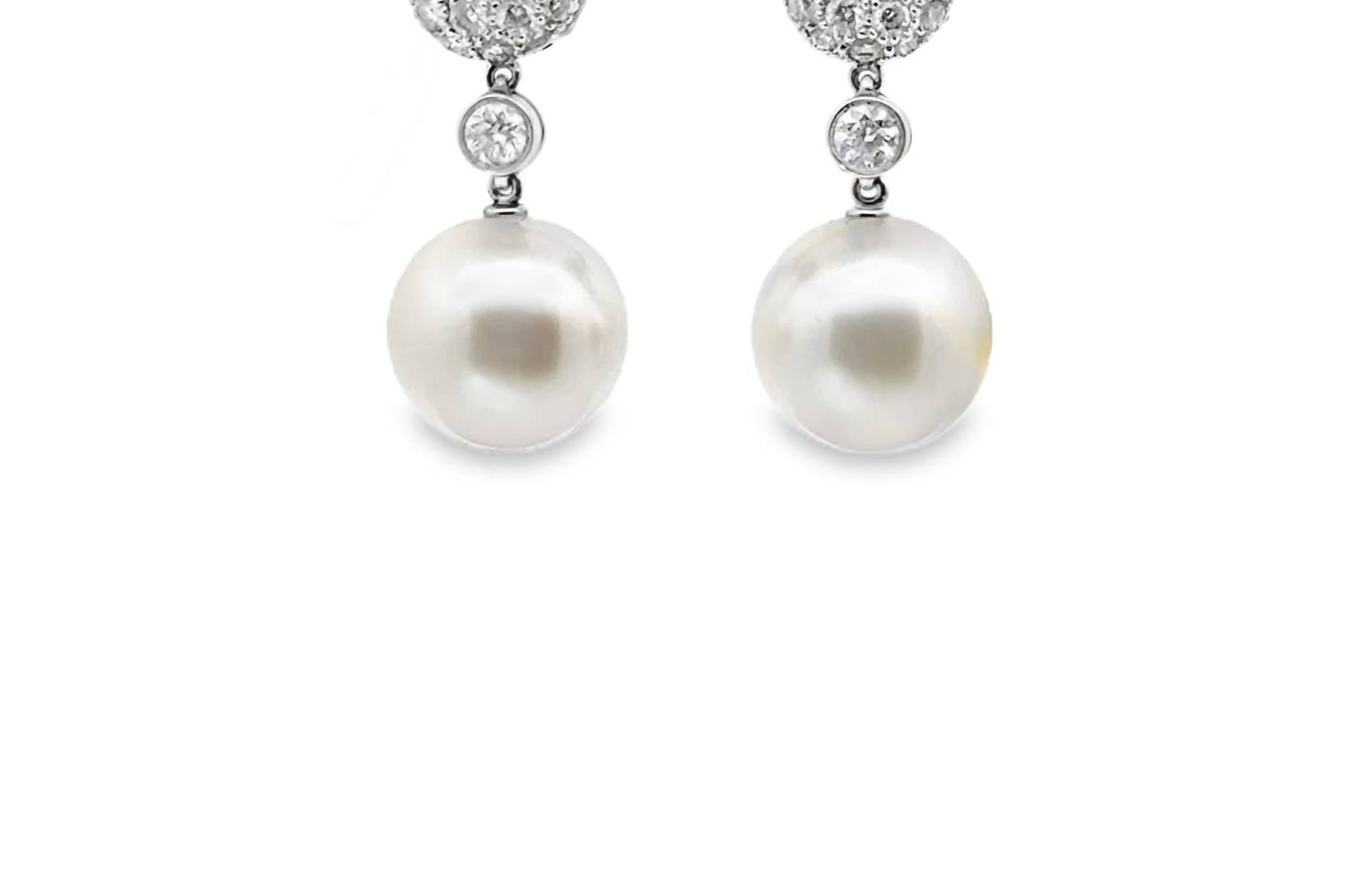 Classic earrings that will take you from season to season. Add a touch of elegance to your collection with the Women's Pave Diamond and Pearl Drop Earrings by Octagon. Crafted from 18k white gold, these fine jewelry pieces feature round brilliant diamonds totaling 1.51 carats and two natural round pearls. Measuring 1" in length, these earrings offer a premium D-F colorless diamond grade and secure with a post clasp. Brandishing a sophisticated design in a colorless finish, they are an ideal choice for April birthdays.