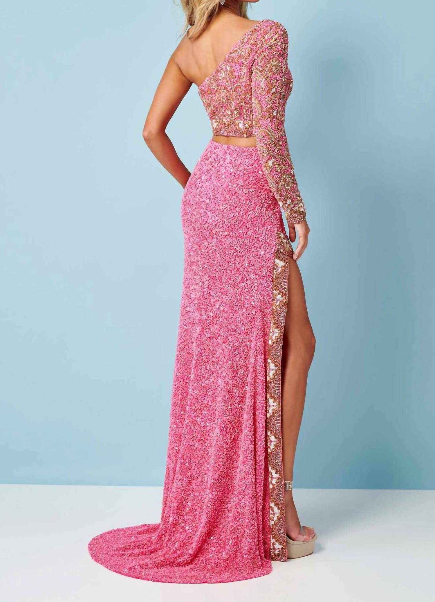 Just add a cute little clutch and a matching heel for the perfect event look. Introducing the exquisite Rachel Allan 70331 2-piece set, designed to make you the star of any evening event. This prom gown features a one-shoulder long sleeve asymmetrical crop top with a fitted bodice, adorned with finely patterned beading. The accompanying skirt, embellished with intricate beads and textured sequins, boasts a high slit and sweep train for a dramatic silhouette.