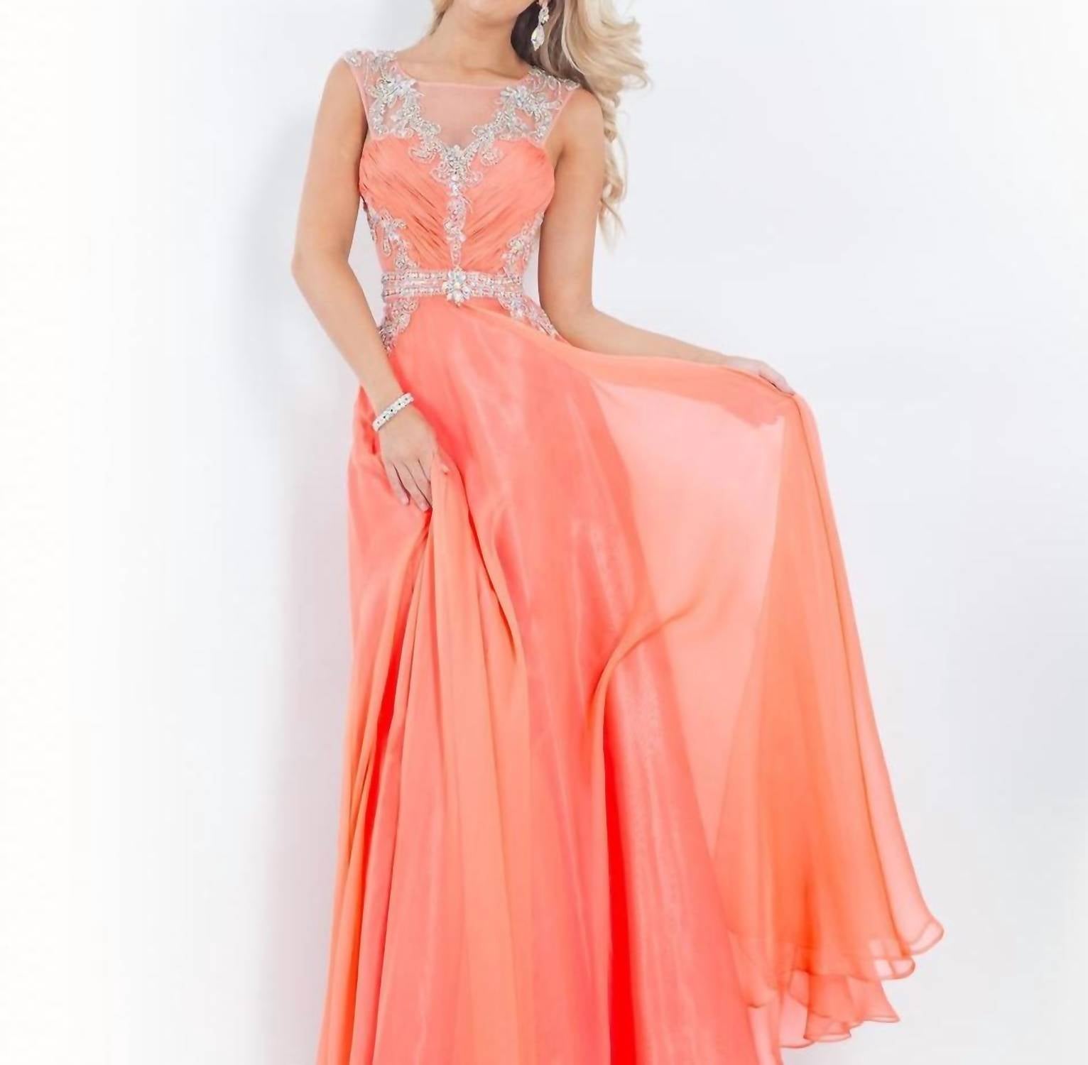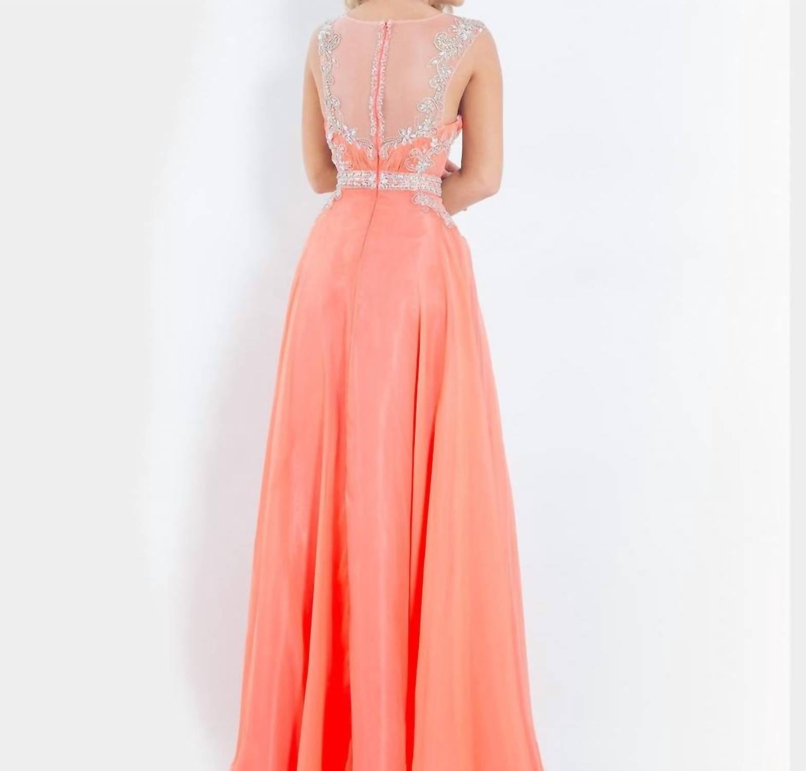Turn heads in the cutest and most flattering evening dress. The Beaded Chiffon Prom Gown by RACHEL ALLAN is a stunning choice for any special occasion in a vibrant coral hue. This sleeveless dress boasts a high mesh neckline detailed with exquisite beading through the bust, beautifully flowing into an A-line chiffon skirt. Designed for a perfect fit, it features a convenient zip closure. Embrace elegance and make a memorable entrance with this exquisite prom gown.