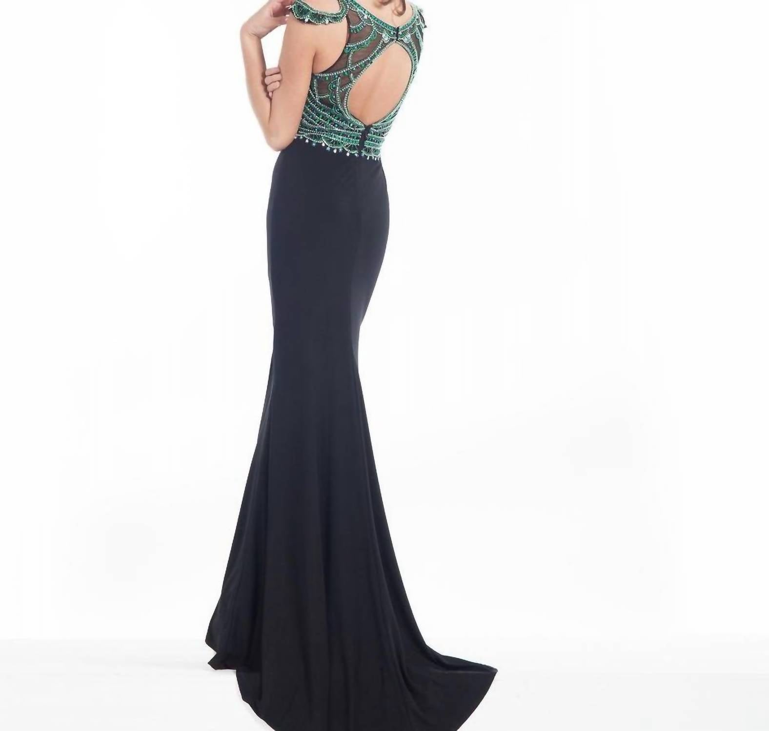 Looking for that perfect event dress? Look no further... Introducing the Beaded Jersey Sheath Evening Gown by Rachel Allan, a sophisticated choice for your next prom event. This stunning gown features cap sleeves and a beaded bodice that elegantly flows into a form-fitting jersey sheath silhouette. The V-neckline and open back design add a touch of allure to this classic black dress. Designed specifically for women, it is perfect for making a memorable entrance.