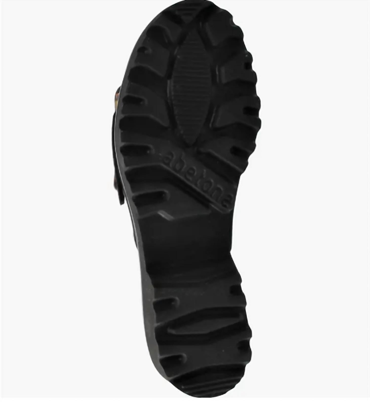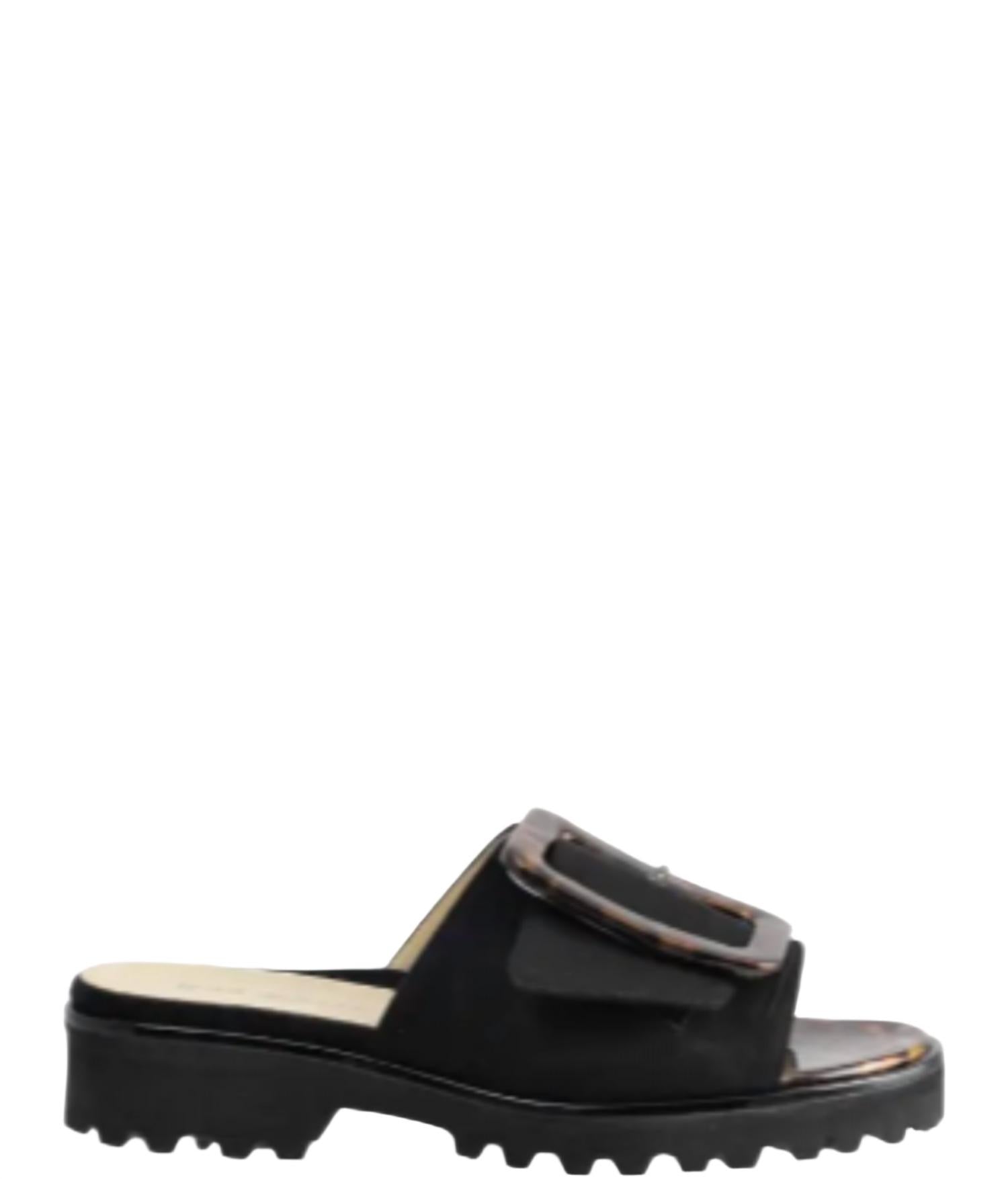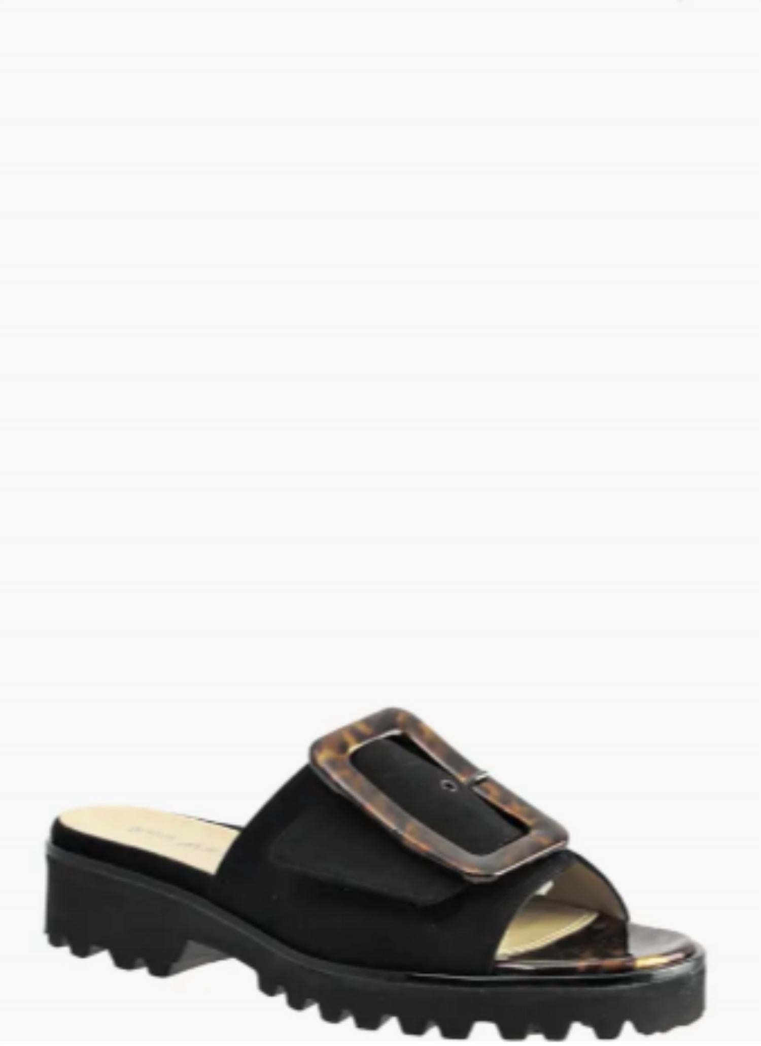 Entre em sintonia com a elegância com a Sandália Candra Slide da Ron White, criada em um preto sofisticado. Esta sandália feminina apresenta uma luxuosa tira de camurça adornada com uma impressionante fivela com padrão tartaruga. Sua estrutura ultraleve e acolchoada, combinada com um solado robusto, garante conforto e durabilidade.