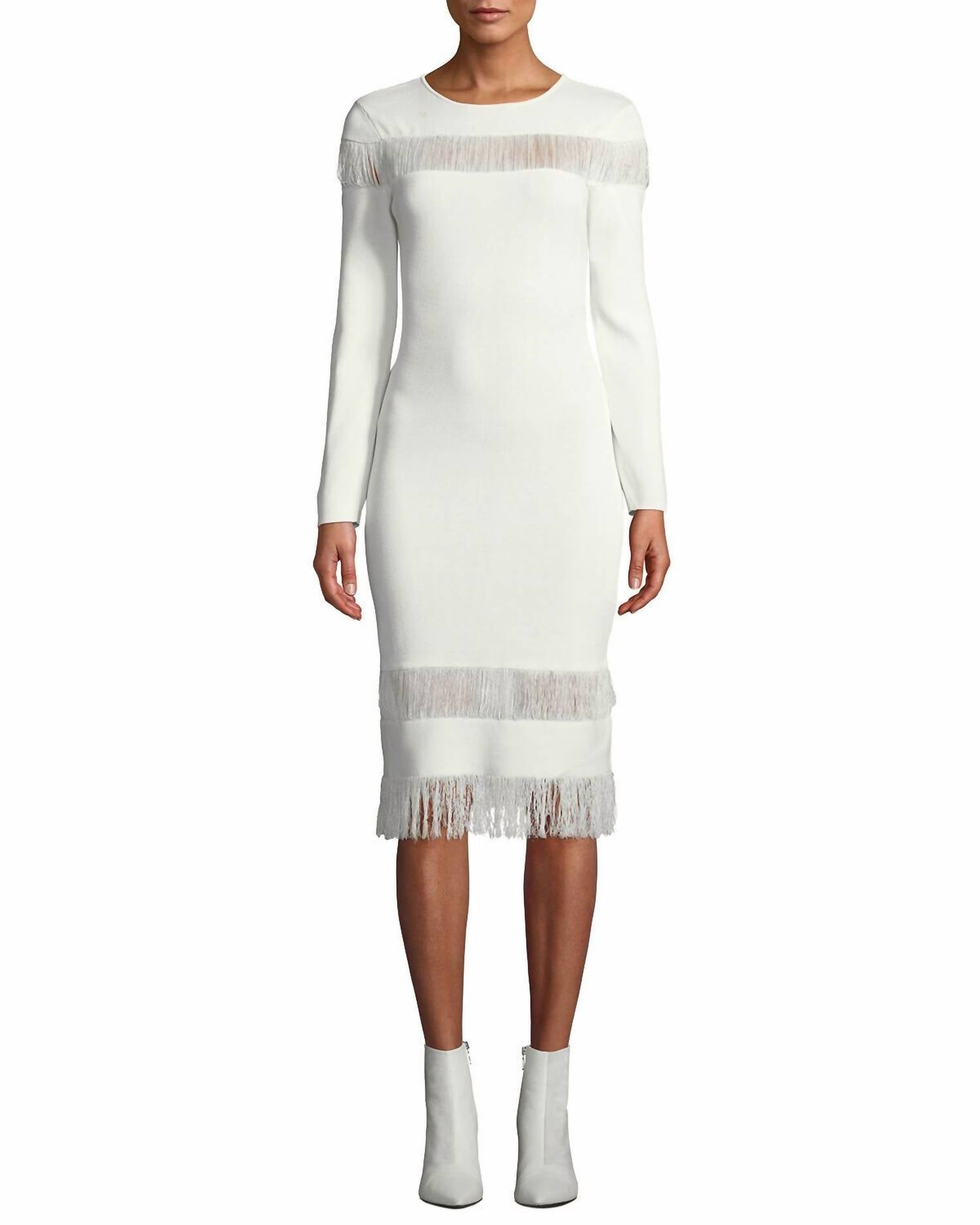 Bonito e confortável, este vestido de manga longa tem tudo. Revele a sua elegância interior com o Vestido de Manga Longa em Malha com Franjas Seraphina da SACHIN & BABI, em um tom branco imaculado. Este vestido tubinho possui mangas longas tipo bracelete e detalhes de franjas transparentes que se estendem elegantemente pelo peito e pela saia, oferecendo um toque de mistério sem ser muito revelador. Confeccionado em malha de peso médio com 63% rayon e 37% nylon, mede 106 cm de comprimento do ombro à bainha, proporcionando uma silhueta sofisticada. Esta peça apresenta uma gola redonda clássica e um prático fecho de zíper nas costas, sendo perfeita tanto para o dia quanto para a noite, mesmo após lavagem a seco. As medidas incluem 44 cm de largura nos ombros, 43 cm de peito, 36 cm de cintura, 46 cm de quadril, 47 cm de quadril e 58 cm de mangas.