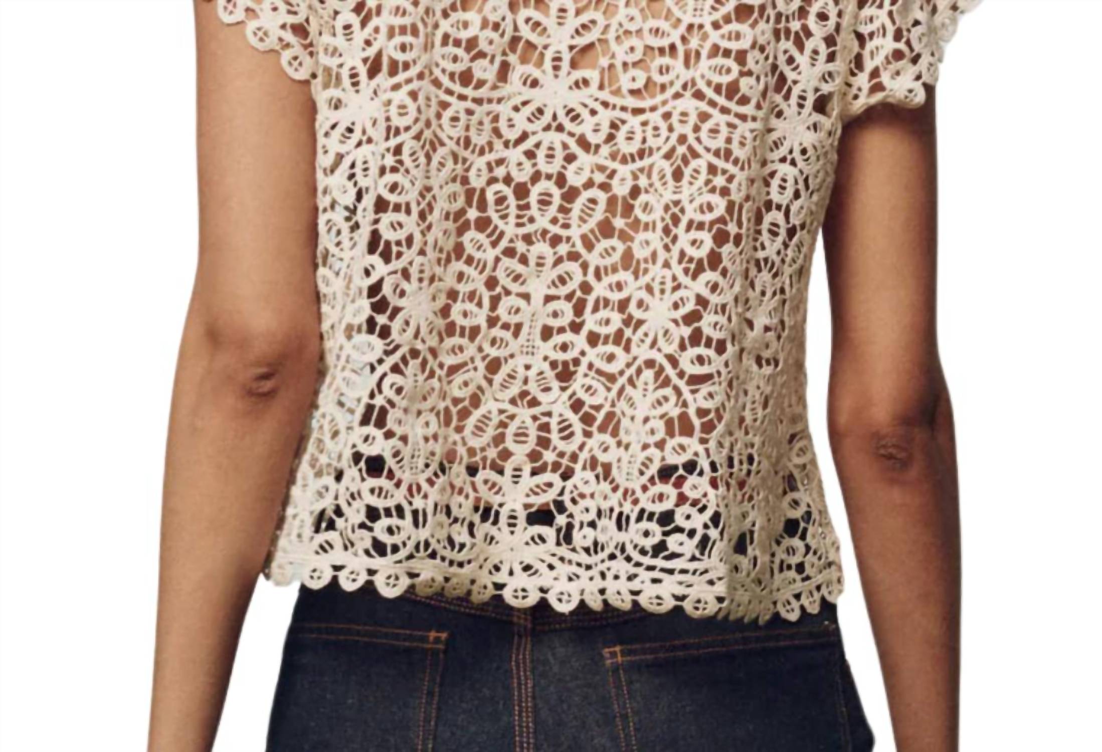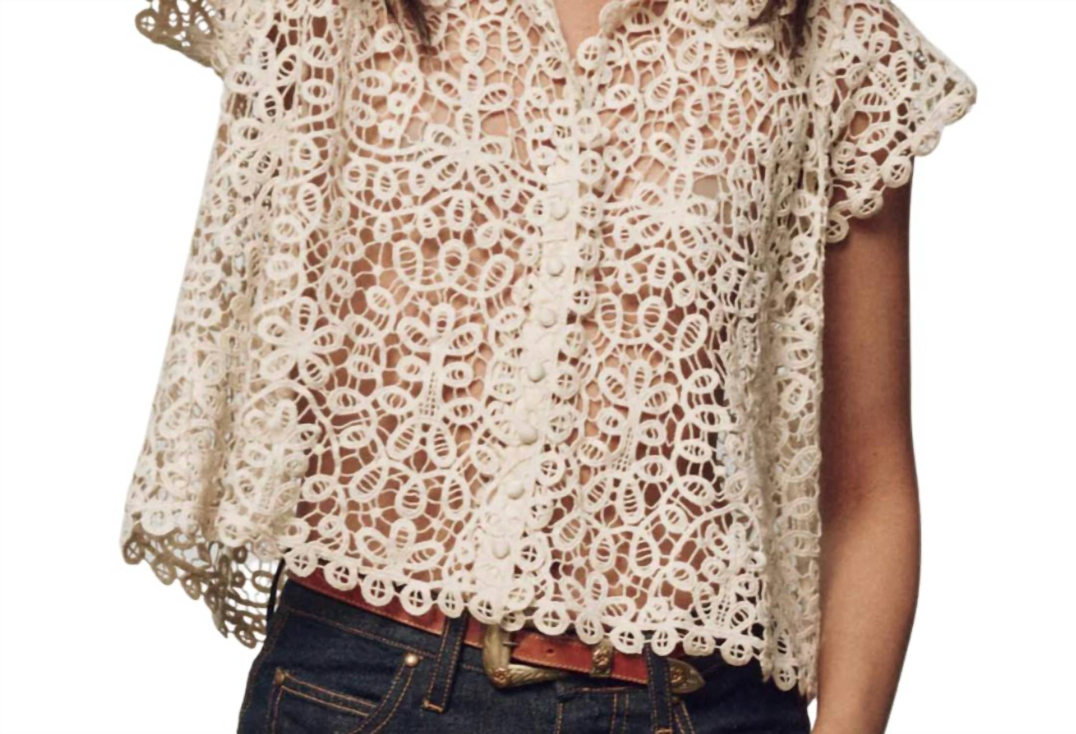 Uma blusa versátil que pode ser usada do escritório ao jantar! O GRANDE. O topo da treliça Algodão em Creme Blusa de renda pesada intrincada Padrão vazado Bordas de renda recortadas Manga curta com pala De colarinho Ajuste quadrado Forro de viscose Botões auto-cobertos Tamanho 1 Comprimento 21"