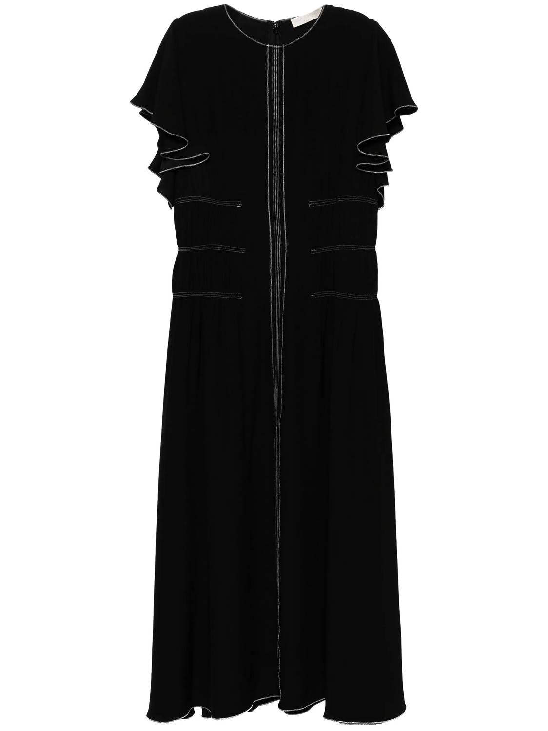 Um vestido midi tão versátil que suas opções de uso são infinitas. Uma adição chique ao seu guarda-roupa de outono em tom noir. Vestido longo com mangas bufantes e cós elástico para uma silhueta evasê elegante. Confeccionado em 100% viscose com textura crepe e costuras contrastantes. Fecha com zíper traseiro oculto para um acabamento sem costuras. Lavagem a seco somente.