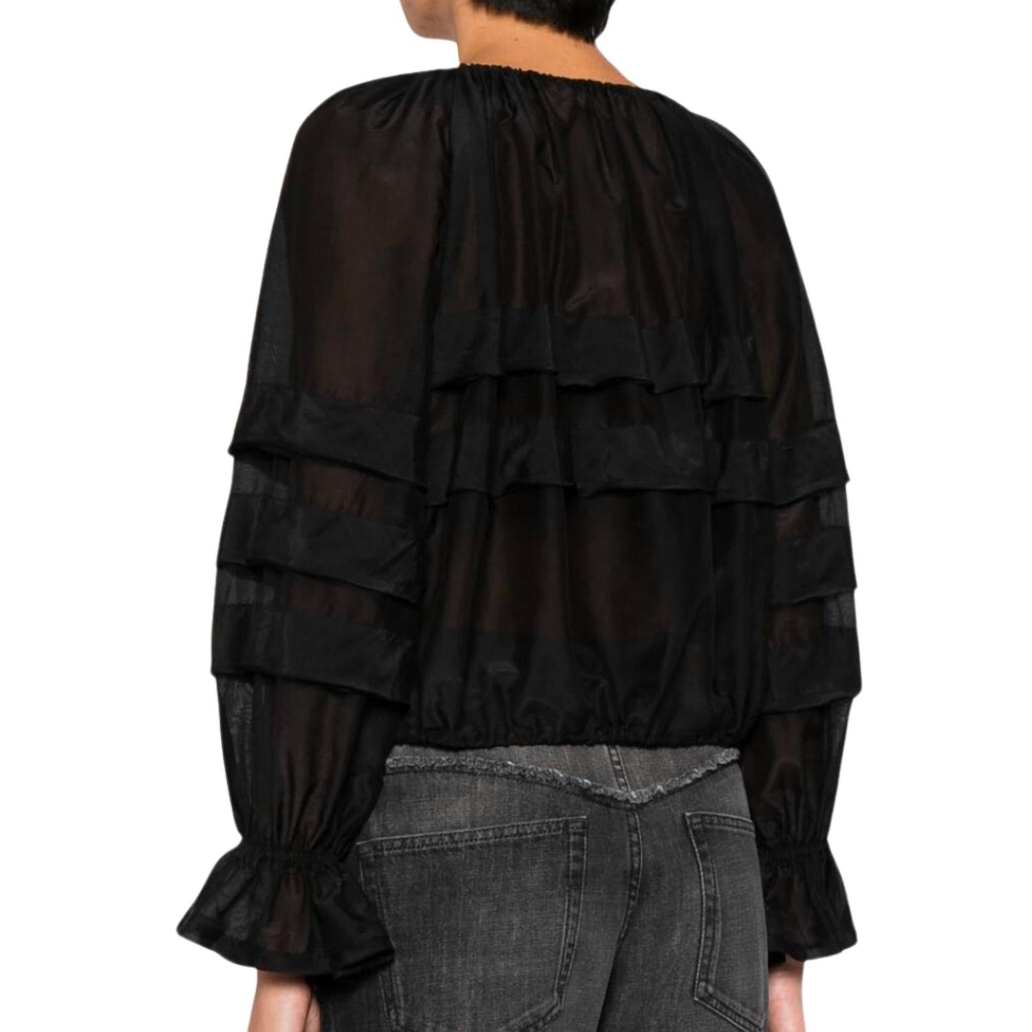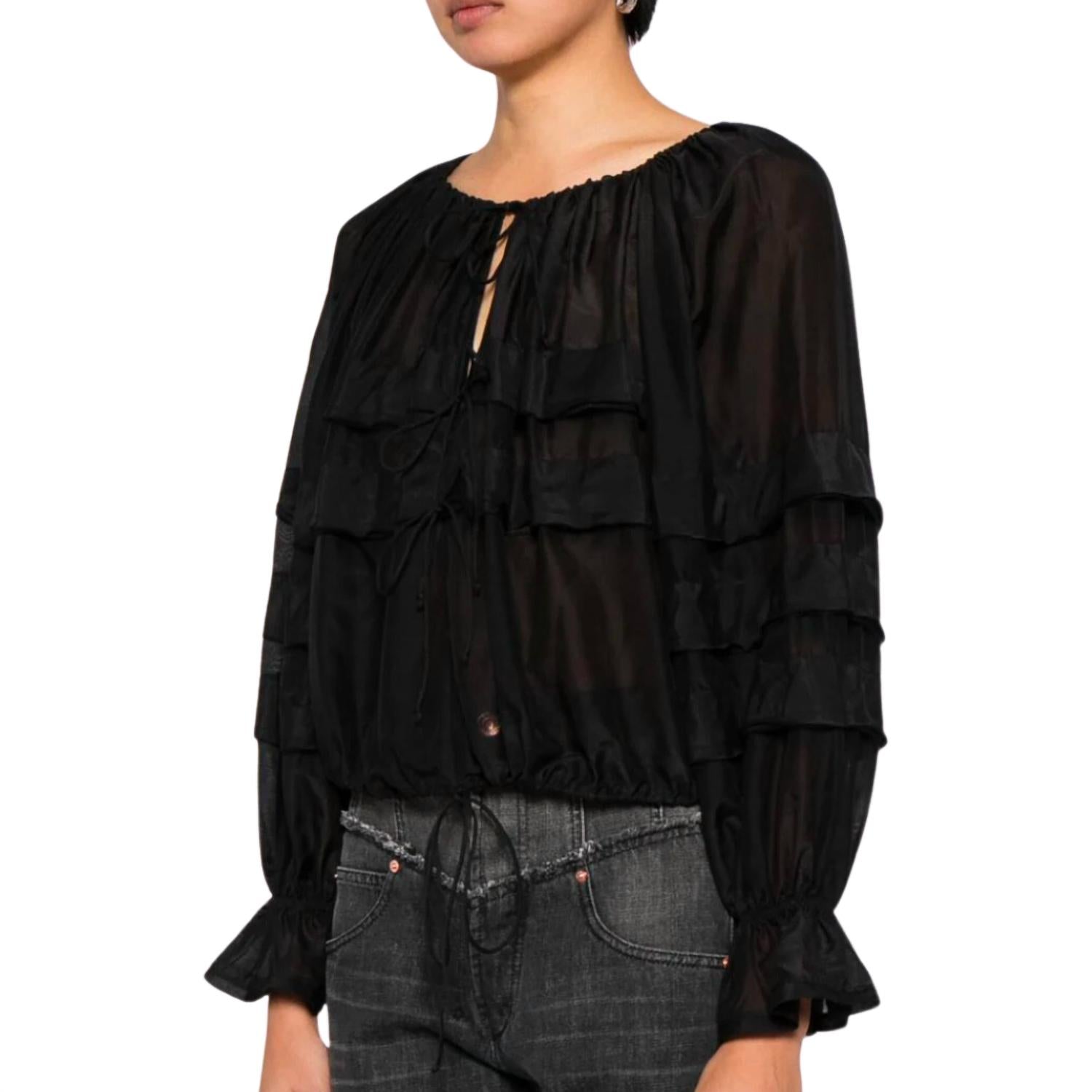 Uma blusa atemporal que nunca sai de moda. Blusa Ulla Johnson Cora Seda, algodão em preto Blusa longa com manga bufante Cintura ajustável Cordão com amarrações Fenda no pescoço com amarrações Punho elástico na manga Estilo pulôver Detalhes com babados Tamanho real Lavagem a seco