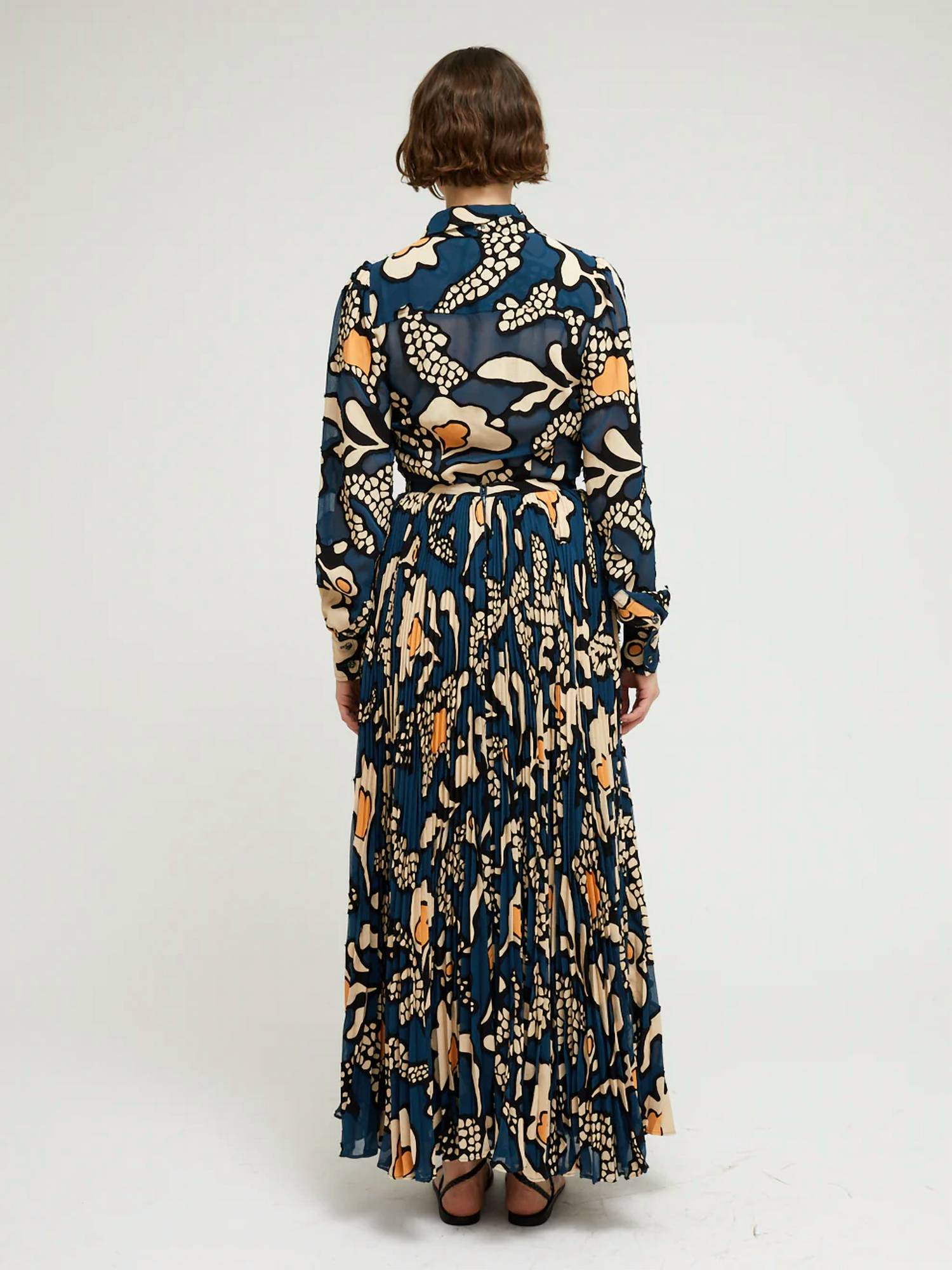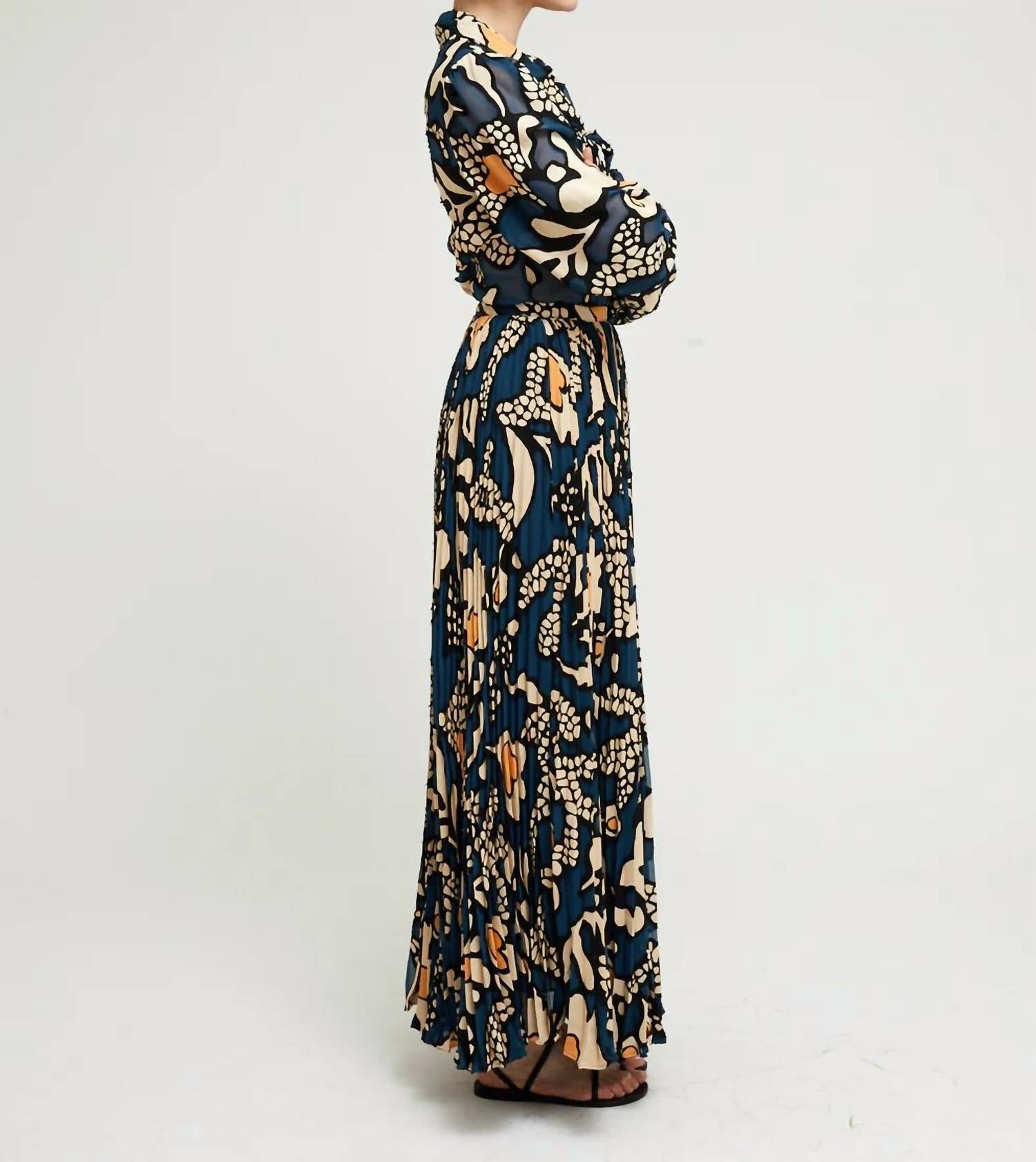 Saia maxi deslumbrante para mulheres, confeccionada em tecido Devoré na cor azul petróleo. Com estampas florais abstratas em bege e laranja, ela transmite uma estética boho chic, perfeita para festas de fim de ano. Confeccionada em uma mistura de 59% viscose e 41% poliéster. Possui zíper lateral invisível e é totalmente forrada com tecido transparente. Pode ser lavada à mão.