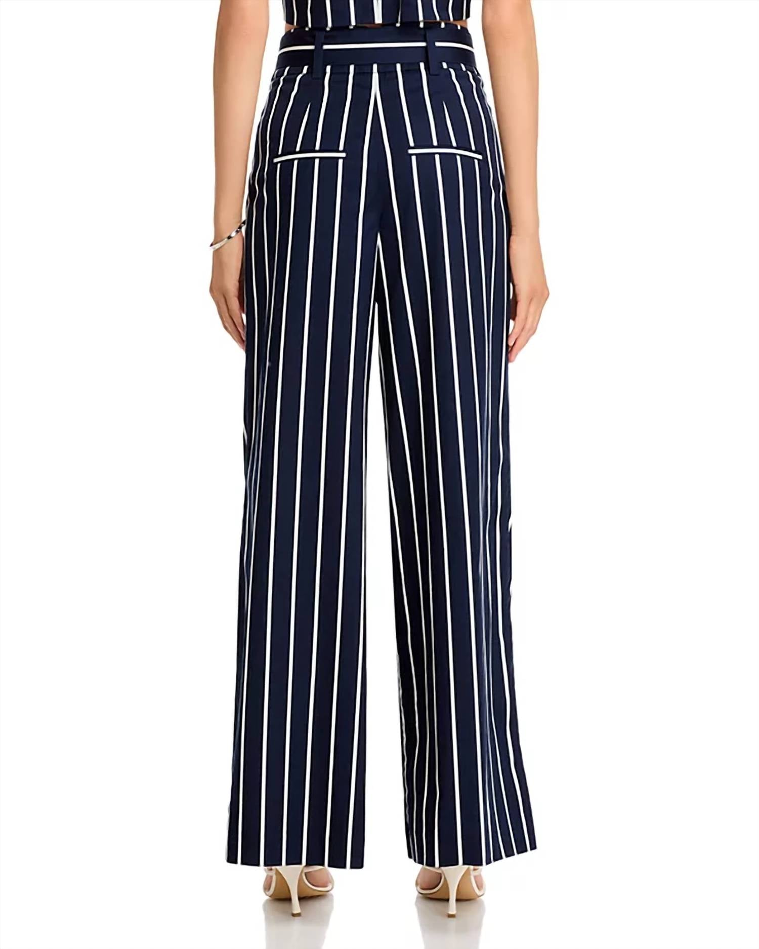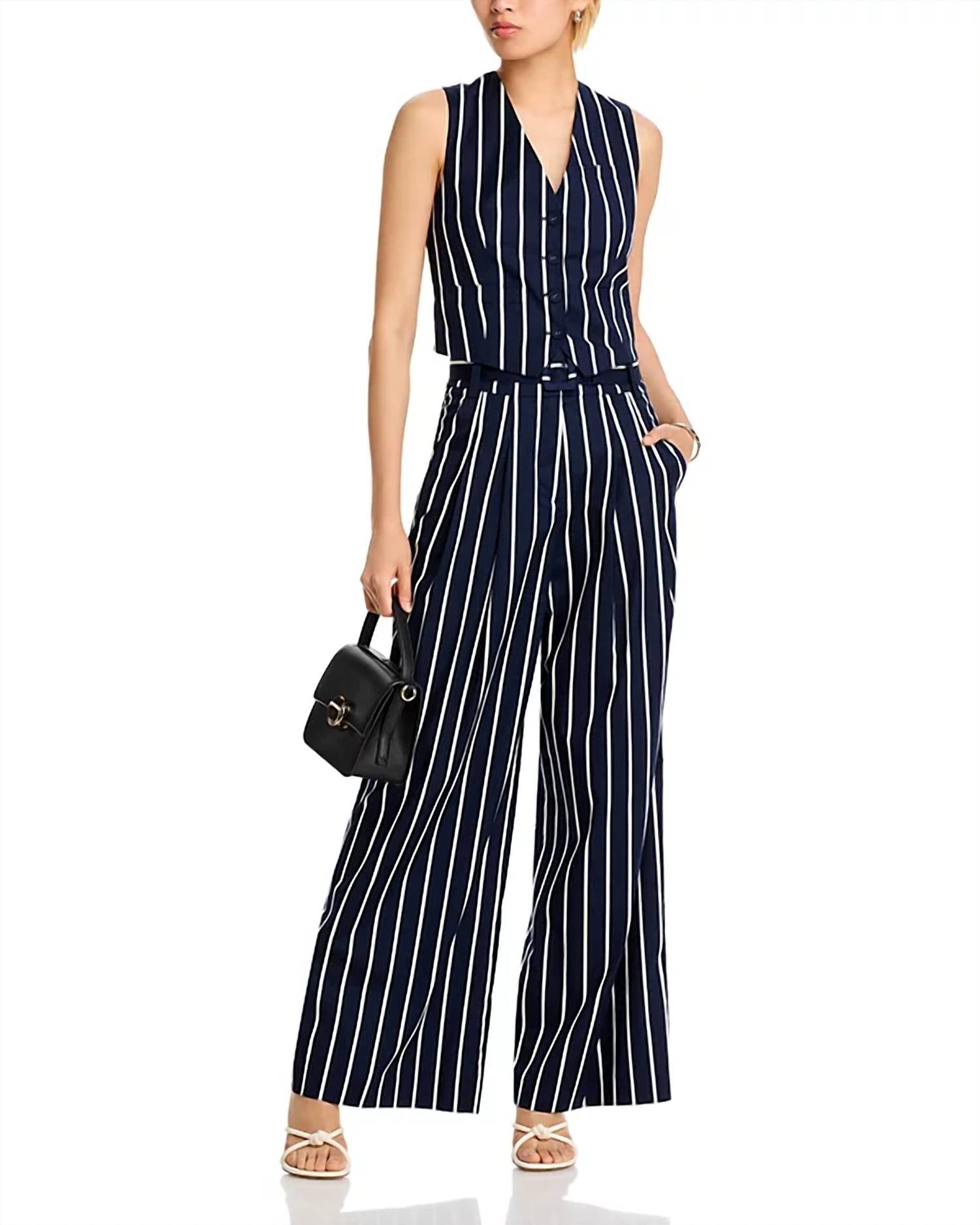 Eleve seu guarda-roupa com a Calça Maliyah da Veronica Beard, com uma estampa marcante de listras em azul-marinho e branco. Confeccionada em uma luxuosa mistura de algodão elástico, esta calça de perna larga oferece um caimento relaxado com cós de 33 cm e costura interna de 81 cm. Projetada com estilo e funcionalidade em mente, ela inclui bolsos práticos com debrum no quadril e bolsos traseiros embutidos. Fechamento: Colchete na cintura com braguilha com zíper e cinto para um toque especial. Composição: 97% algodão, 3% elastano; Forro: 100% algodão. Cuidados: Lavagem a seco somente.