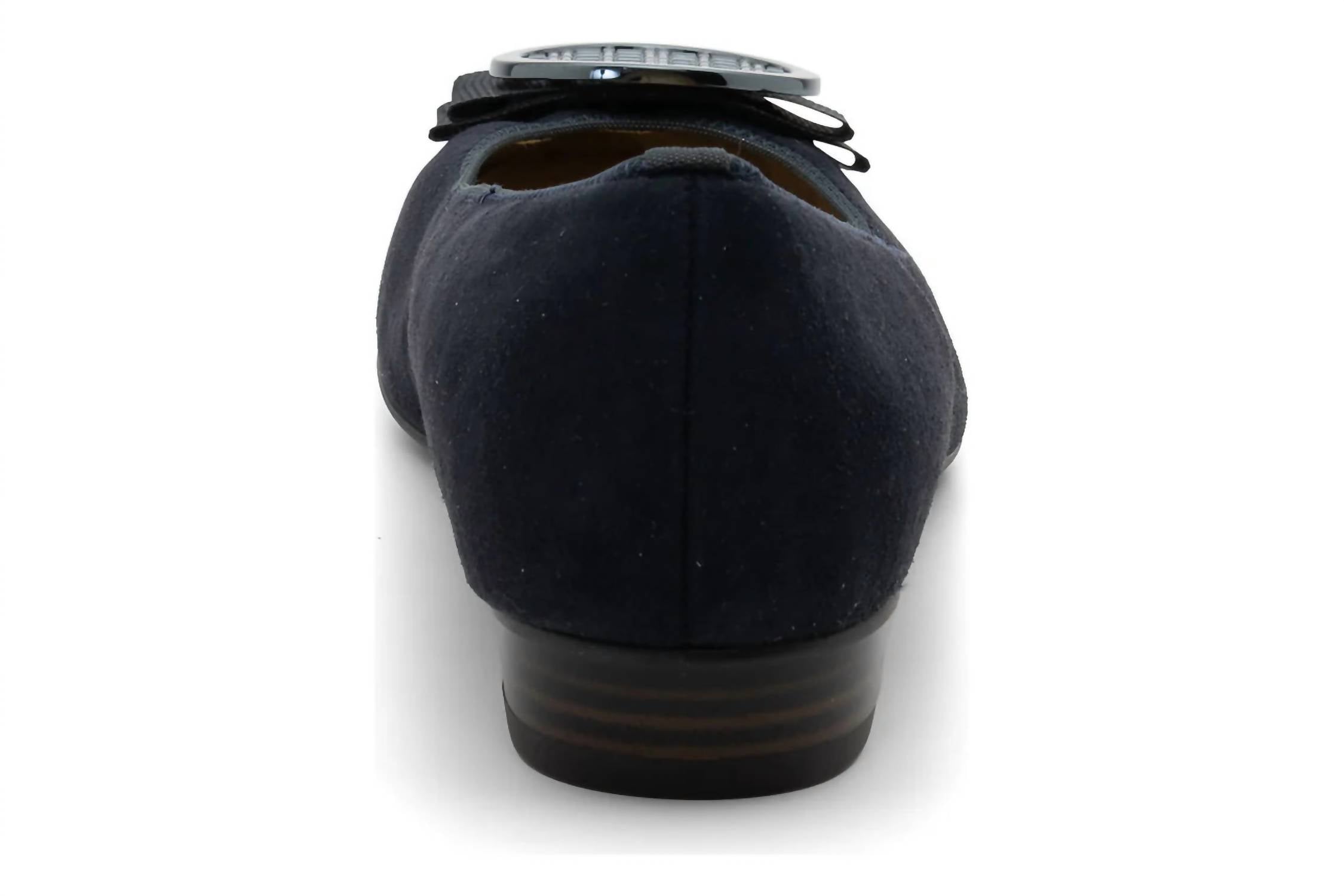 Loafers so versatile you can wear them with just about anything. Introducing the Women's Bambi Slip-on Flat by Ara Shoes, a perfect blend of comfort and style for any occasion. Crafted with a black Puntikid suede leather upper and detailed with a chic lattice brooch atop a grosgrain bow, these flats exude elegance for summer workwear or evening events. The almond toe design is complemented by a padded footbed featuring Ara's HighSoft technology, delivering shock absorption and superior breathability. Lined with leather and textile, it features a synthetic sole, ensuring unparalleled comfort and stress-free walking.