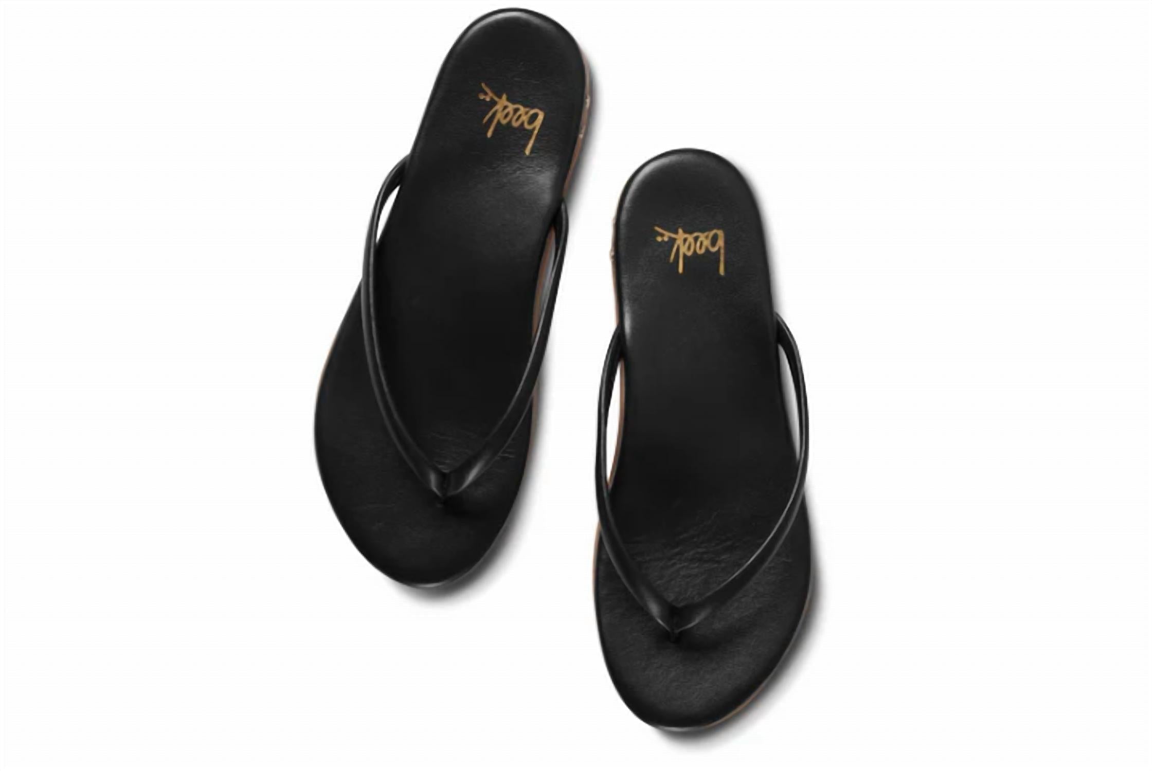 Discover the Women's Sunbeam Leather Flip Flop by Beek, meticulously crafted from the softest, most luxurious leather. These sandals feature two slim, foam-filled leather-wrapped straps, a memory foam–padded leather insole, and Beek’s signature molded arch for unmatched comfort and support. They're perfect for summer vacations with flat heel styling and a medium shoe width, offering minimalist elegance in a chic black hue. Originating from Leather Working Group–certified sources, these sandals exemplify Beek's commitment to sustainability and style.