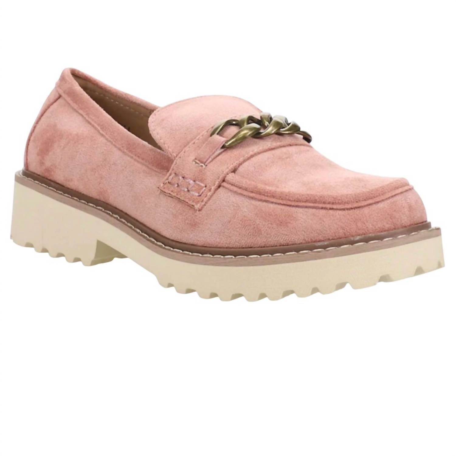 Step into comfort and style with the Women's Literally Loafer by Corkys Footwear in Blush, perfect for spring travels or Thanksgiving gatherings. Crafted from a suede-like faux suede material, these loafers feature brass hardware details and a comfortable Corkys soft and squishy footbed. The low chunky heel measures approximately 1.5 inches, making them an ideal choice for all-day wear. Designed with a round toe, these man-made material loafers capture the essence of 90s fashion.