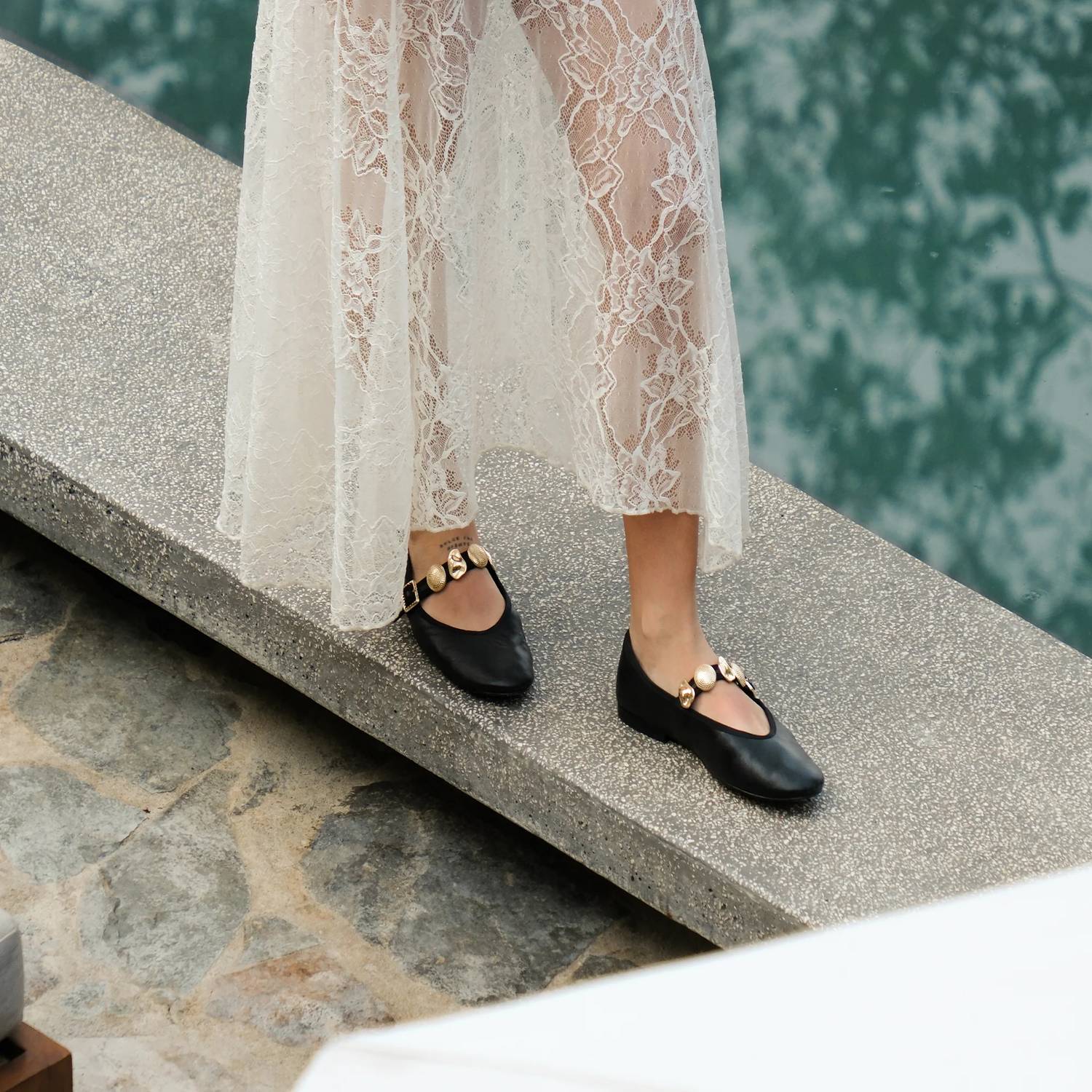 RELAN’s comfortable yet elevated design is made fresh by bold colorways and textures for fall. This sustainably-crafted, round-toe ballet flat features light-catching gold accents along the strap. She’s perfectly sophisticated for the office or casual weekends out.