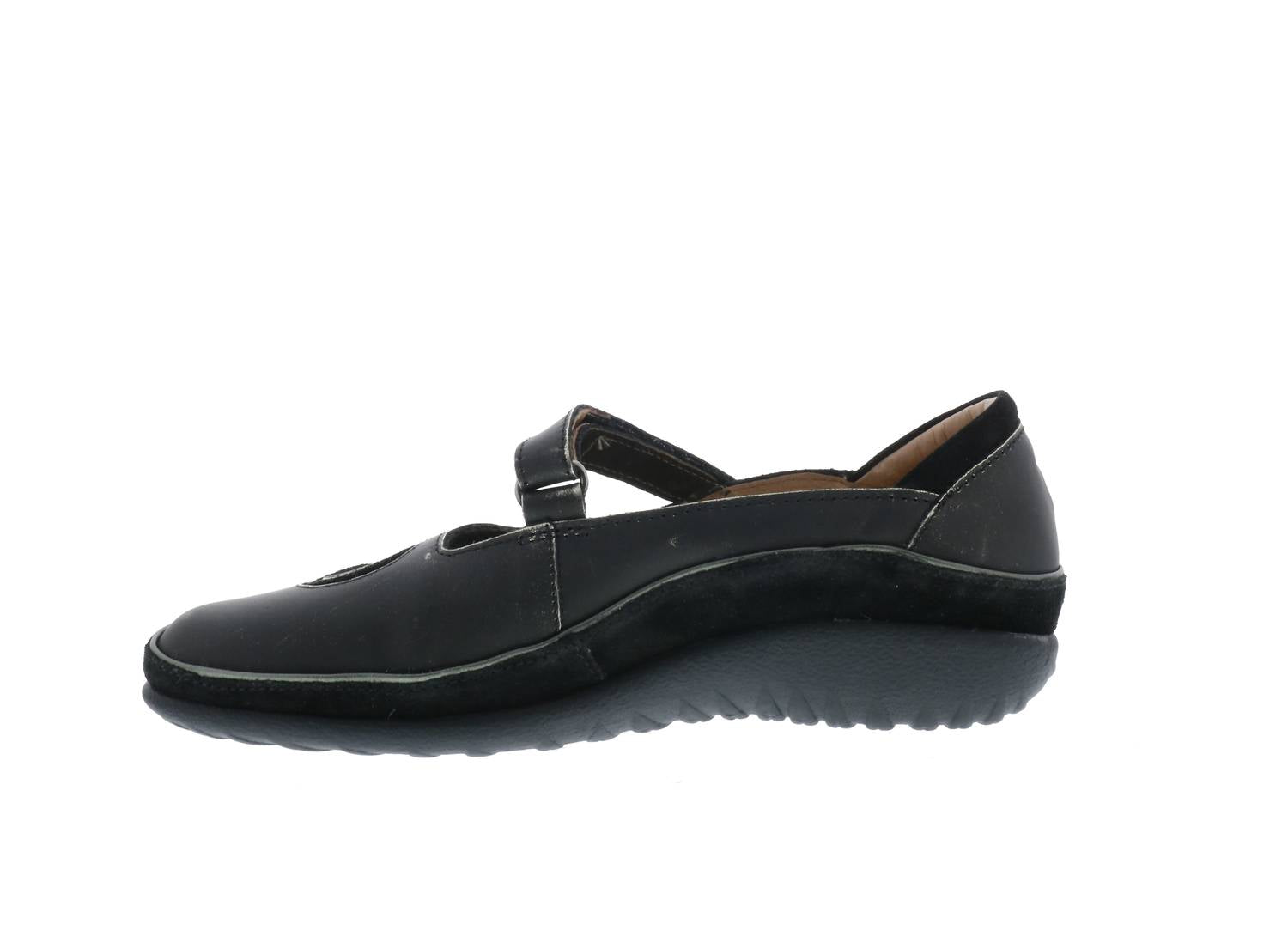 Loafers so versatile you can wear them with just about anything. Step into comfort and style with the Women's Matai Swirl Shoe by NAOT in Metal Black. Featuring a contrasting swirl design, this Mary Jane shoe offers a padded heel cup and a hook & loop closure for adjustable fit. It's equipped with Naot's removable, anatomic cork & latex footbed wrapped in suede, and a 1" lightweight, slip-resistant polyurethane sole. Careful hand-sewn Strobel construction ensures flexibility and durability, while its APMA acceptance underscores its foot health benefits. Perfect for a minimalist, spring look, true to size, half sizes should size up to ensure the best fit.