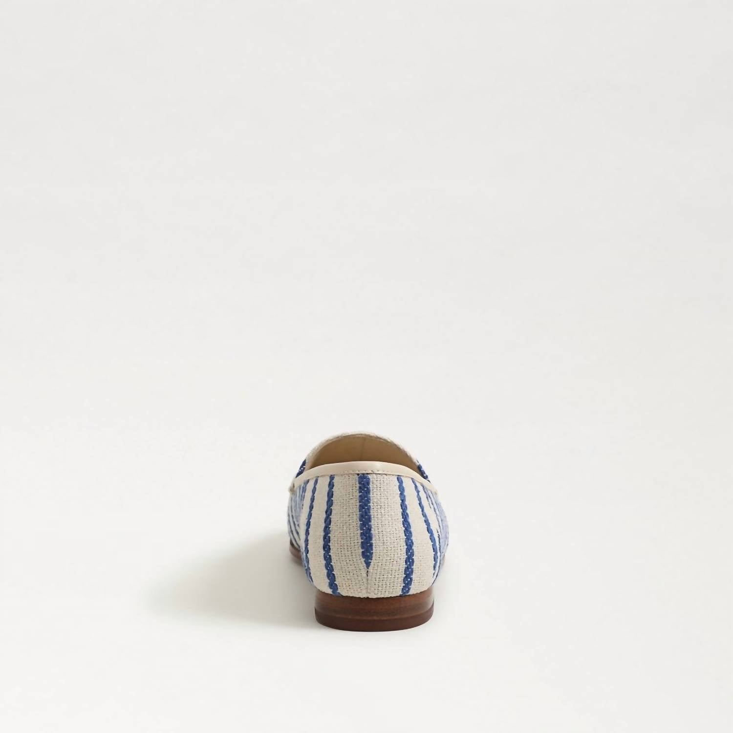 A classic loafer that is both comfortable and polished. Step into timeless elegance with Sam Edelman's Women's Loraine Stripe Canvas Loafer in Cobalt Blue Stripe Canvas. Featuring an almond toe and highlighted by a sleek flat heel measuring 0.5 inches, this shoe seamlessly blends classic design with contemporary flair. Crafted from a mix of faux leather, leather, velvet, or fabric, it's PETA approved, cruelty-free, and ethically sourced, ensuring comfort without compromise. The padded leather insole elevates your wearing experience, making it the perfect choice for a chic vacation look or a nod to 90s fashion.