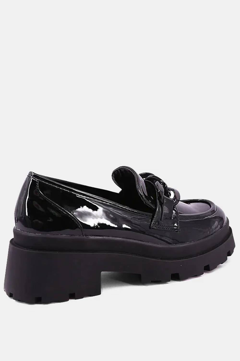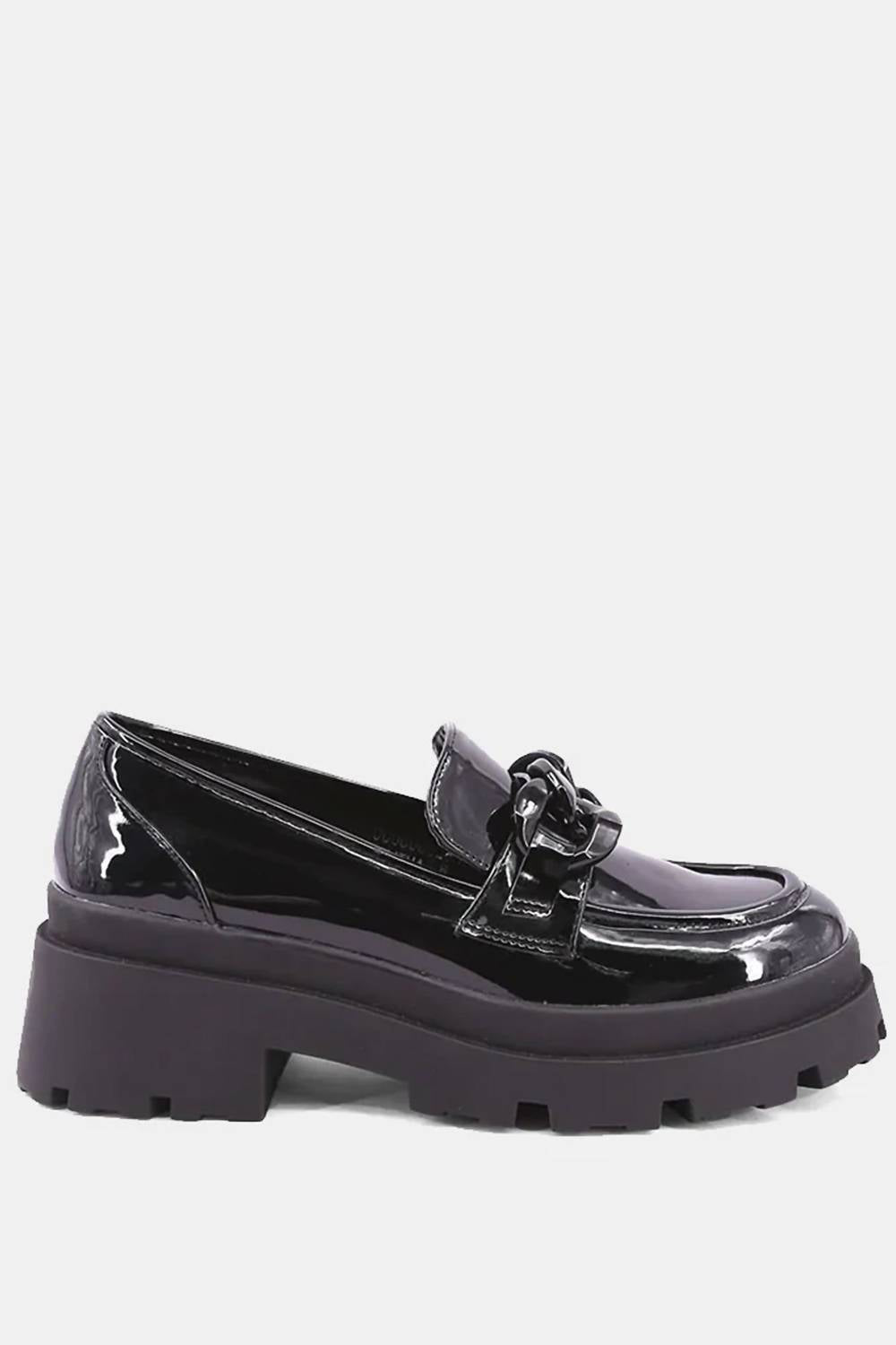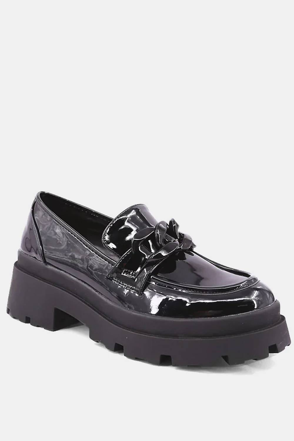 Uma versão elegante e feminina do clássico mocassim. Apresentamos o Talitha Loafer da SHU SHOP, uma homenagem chique à moda dos anos 90 com um toque moderno. Estes mocassins apresentam um design de bico redondo em preto elegante, confeccionados em couro sintético envernizado para um acabamento marcante. Um solado retrô chamativo e detalhes em correntes fazem deste calçado um item de destaque em qualquer guarda-roupa. Perfeitos para dar um toque de glamour ao seu visual, eles servem facilmente como uma âncora versátil para conjuntos vibrantes.