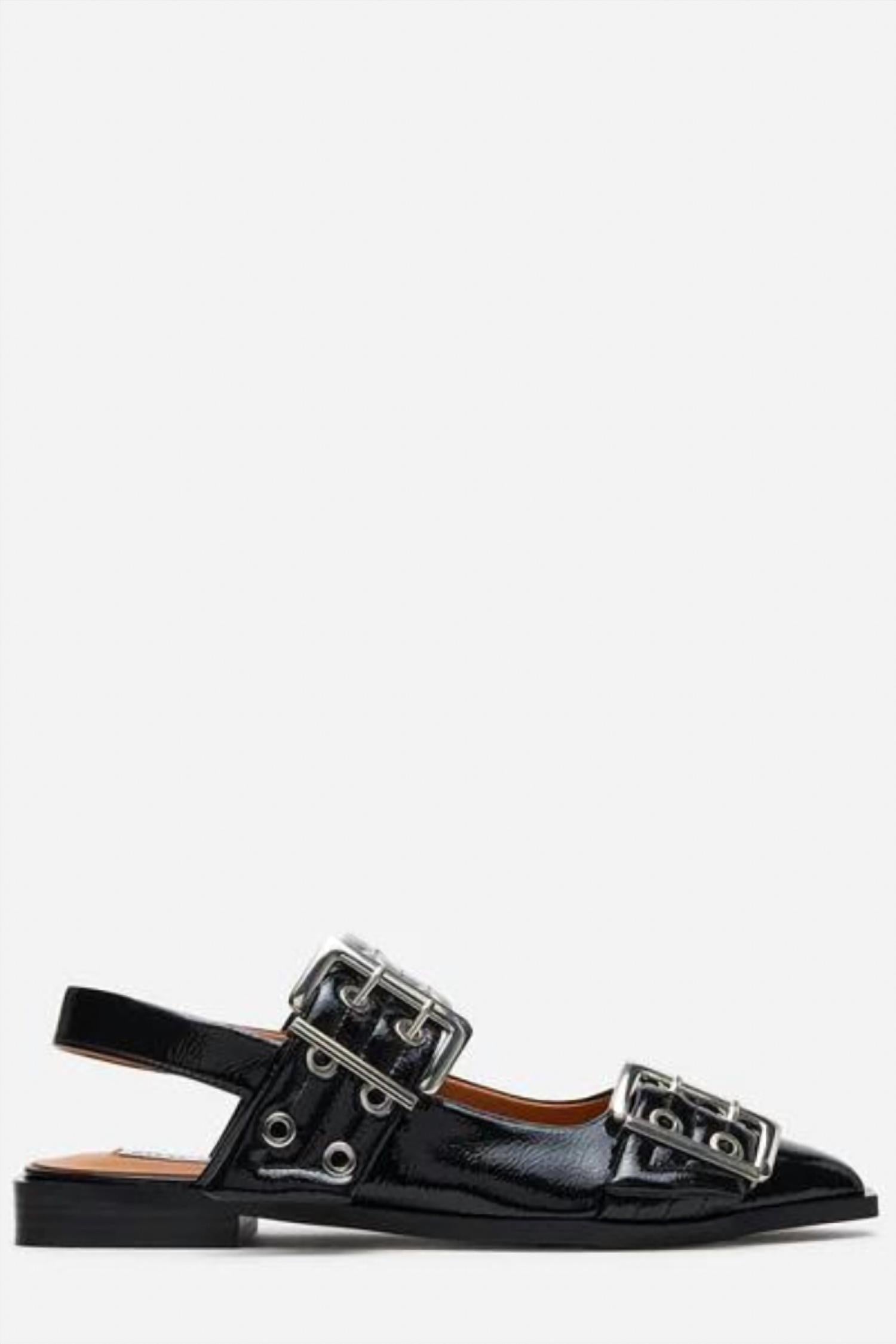 Introducing the Graya Pointed Toe Flats by Steve Madden, a pair of stylish slingback flats in sleek Black Patent perfect for any evening event. Crafted from durable synthetic upper material, these flats feature a striking pointed toe with snipped sole and a comfortable low block heel. Imported and designed with chunky grommets and oversized buckles, the wide straps lend an edgy flair. Lined with leather and equipped with a leather sock for added comfort, these flats are true to size and easy to wear all day.