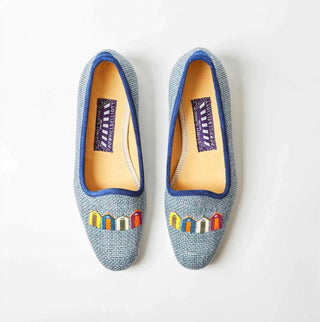 Bowhill & Elliott - Women's Denim Linen Pumps with Embroidered Beach Huts