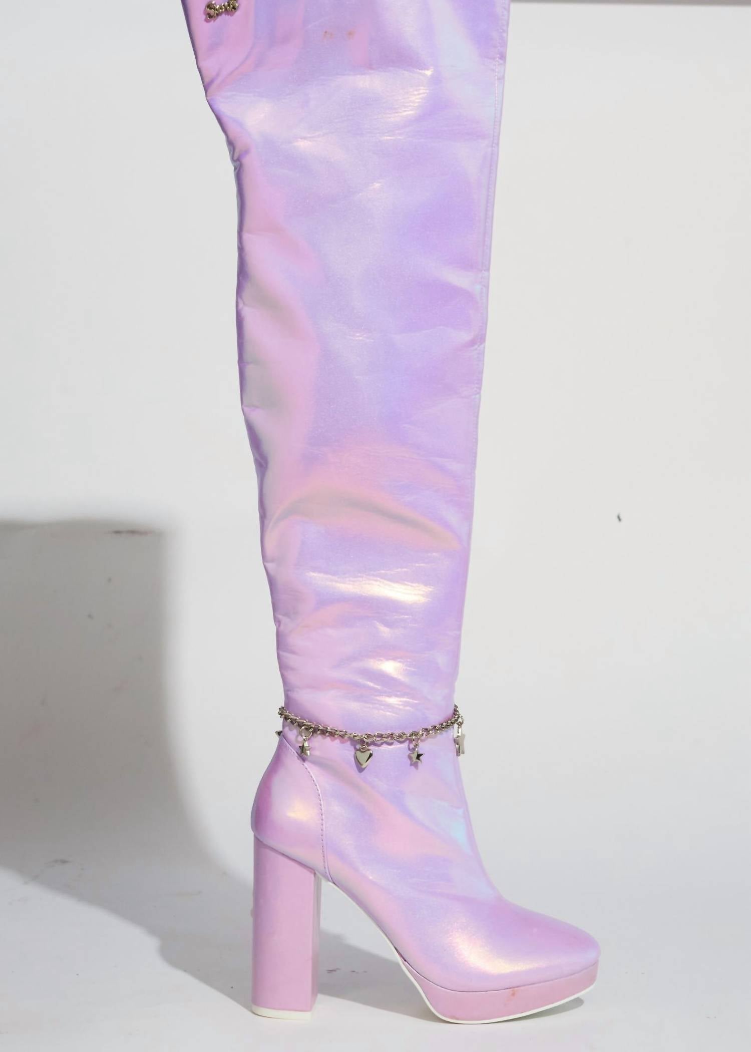 Uma tendência que veio para ficar. Apresentamos a Bota Feminina Naomi da Sparkl Fairy Couture, uma deslumbrante personificação do estilo em um cativante tom lilás iridescente. Estas botas de cano alto acima do joelho apresentam uma silhueta alongada para um efeito dramático, complementadas por um elegante detalhe de corrente em forma de estrela. Projetadas com um prático zíper interno para calçar e descalçar com facilidade, elas garantem estilo e funcionalidade. Com acabamento perfeito, salto bloco e bico arredondado, estas botas são essenciais para qualquer guarda-roupa que queira se destacar.