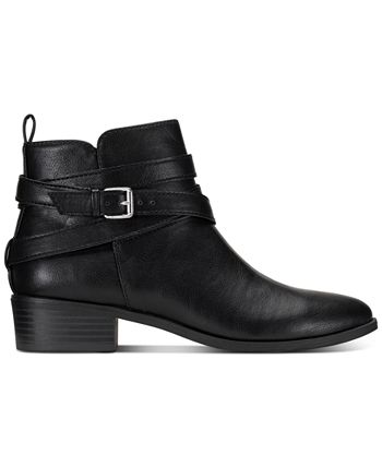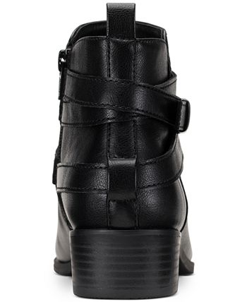 Salto bloco 1-1/4 | Botas de bico redondo com fecho de zíper interno no tornozelo | Tiras com fivela envolvente no tornozelo | Palmilha acolchoada e espuma de memória para maior conforto | Cabedal sintético; forro sintético/tecido; sola de borracha | Importado