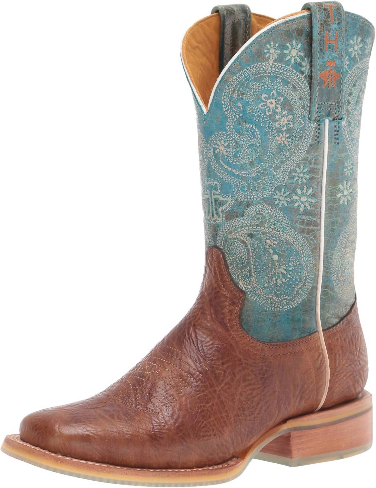Discover the Women's Yee-haw Boots by Tin Haul, a standout in blue and tan designed for the modern woman embracing Western trends. These handcrafted heeled boots feature an 11" paisley embroidered shaft and a round toe, complemented by a burnished honey tan shrunken shoulder vamp. The comfort cushion support system and non-removable cushion insole ensure all-day wearability, while the double welt construction and transparent obvious sole add style and durability. Perfect for summer engagements, these boots boast a leather walking heel block heel style for added stability.
