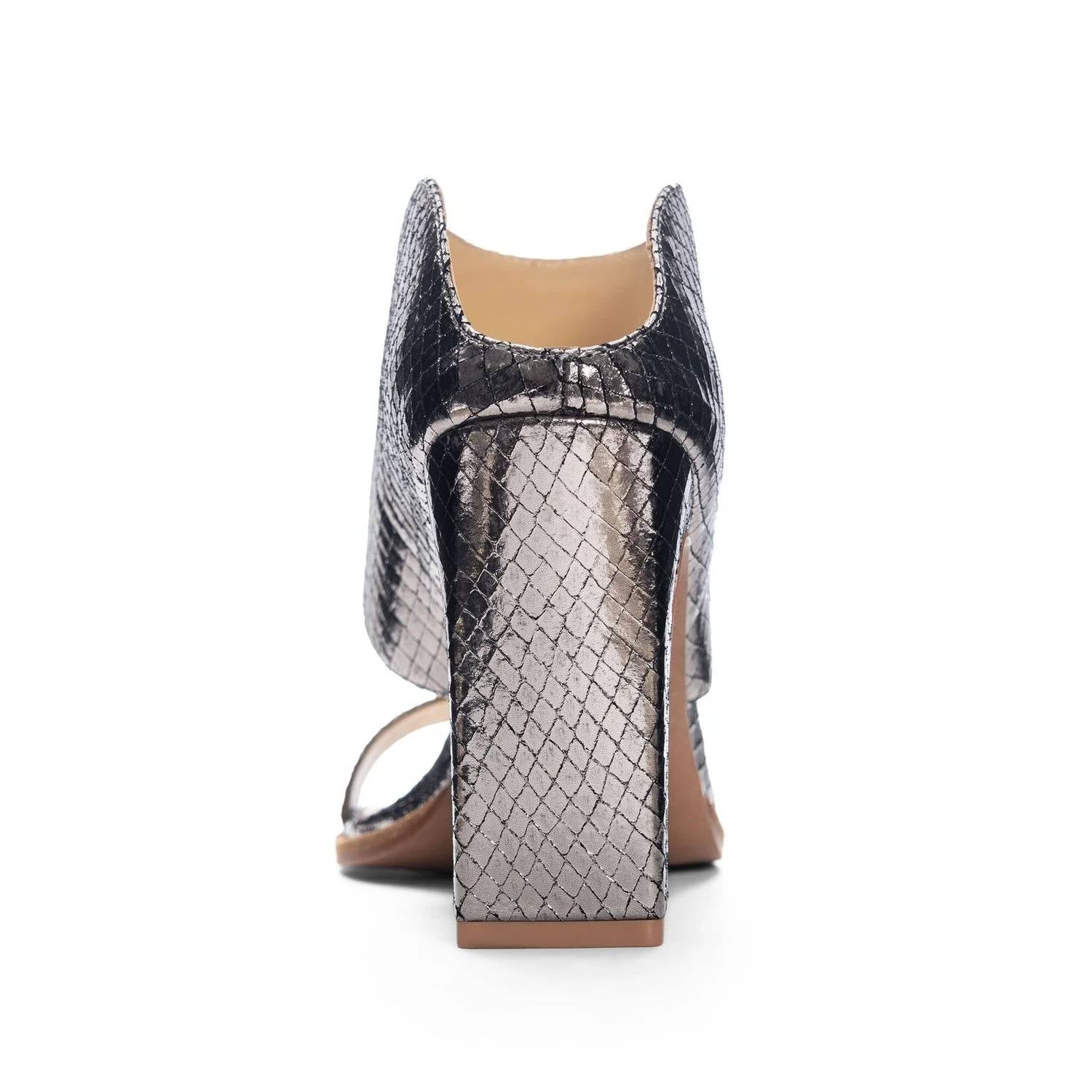 Step into the spotlight, designed for glamorous cocktail parties and featuring a bold Pewter Snake color. Crafted from luxurious leather with a metallic embossed finish. Boast a 4-inch block heel and a sophisticated open-toe silhouette. Double-band vamp and wide heel provide support and comfort, making them an ideal choice for high-heel enthusiasts. Elevate your 90s fashion-inspired ensemble this spring with these striking slip-on sandals.