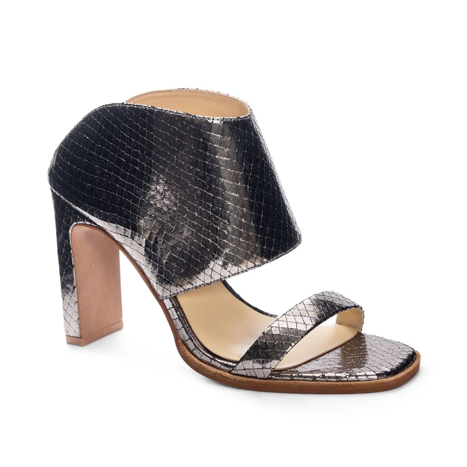 Don't be deceived, these heels are comfy as can be. Step into the spotlight, designed for glamorous cocktail parties and featuring a bold Pewter Snake color. Crafted from luxurious leather with a metallic embossed finish. Boast a 4-inch block heel and a sophisticated open-toe silhouette. Double-band vamp and wide heel provide support and comfort, making them an ideal choice for high-heel enthusiasts. Elevate your 90s fashion-inspired ensemble this spring with these striking slip-on sandals.