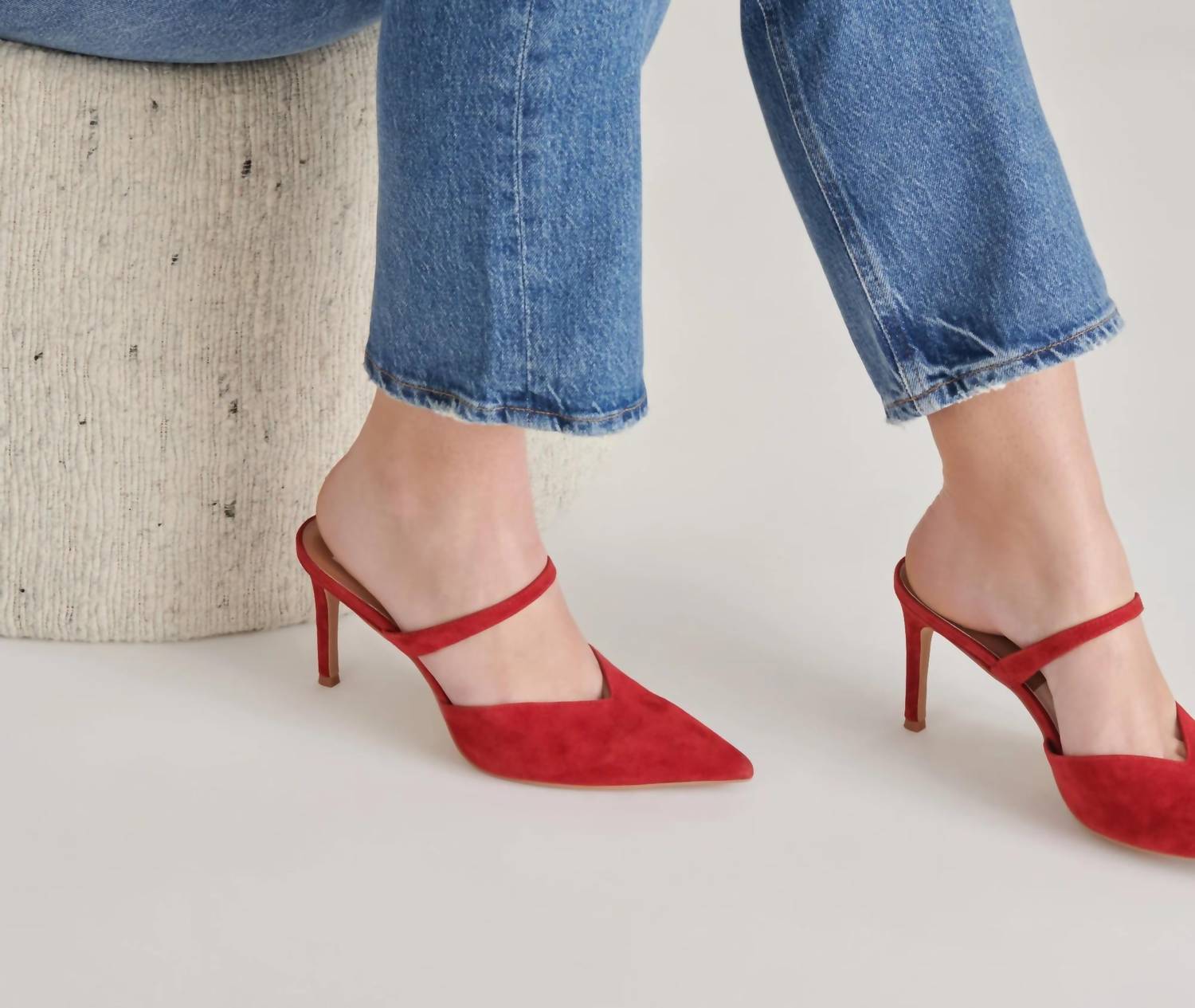 A altura perfeita para o dia e para a noite. Apresentamos o Kanika Heels da Dolce Vita, uma escolha dinâmica com um acabamento ousado em camurça carmesim. Este salto agulha feminino possui bico fino e impressionantes 8,3 cm de altura, perfeito para adicionar elegância a qualquer look. Confeccionado com solado sintético reciclado, forro e palmilha sintéticos, oferece estilo e sustentabilidade. Desfrute de um passo confiante com este par requintado, perfeito para o adulto moderno.