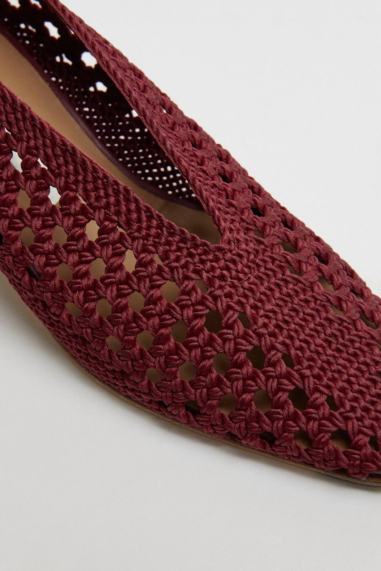 Com cabedal em macramê de algodão trançado à mão, este salto apresenta um design suave em V e bico quadrado elegantemente alongado. A composição inclui couro sintético (algodão) no cabedal, forro em couro de bezerro e um solado de couro resistente com biqueira revestida em borracha para maior durabilidade. Altura do salto: 5 cm. Orgulhosamente fabricado em Portugal.