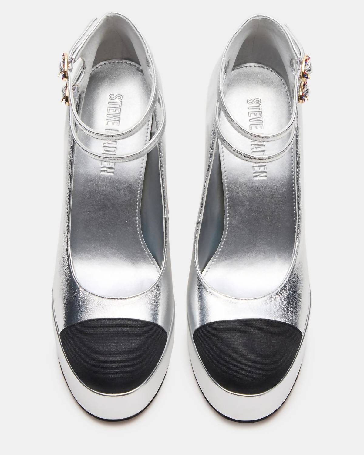 Step into sophistication with the Women's Peyton Genuine Leather Cap Toe Platform Hi Heels by Steve Madden. These silver stunners feature a 5-inch block heel and a 1.25-inch platform for an elevated silhouette. Constructed with a leather and textile upper, these heels offer both durability and style. Imported and adorned with a synthetic lining, sock, and sole, they boast a distinctive toe cap design and a secure ankle strap. Perfect for evening events, they blend fashion-forward design with practical wearability for any occasion.
